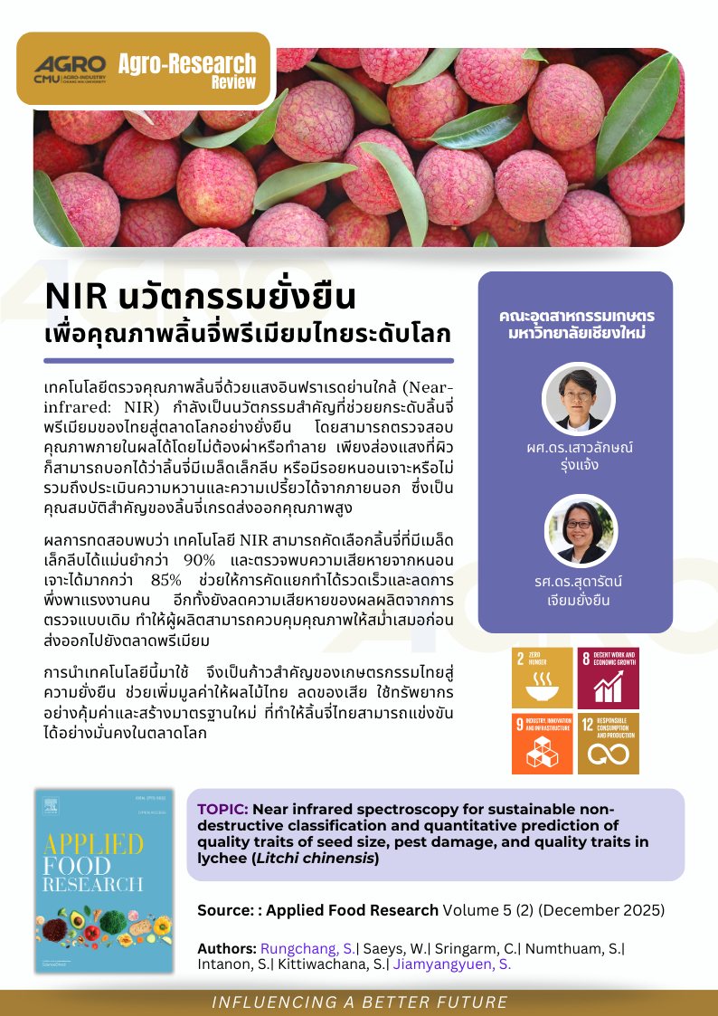 ผลงานวิจัยเรื่อง “Near infrared spectroscopy for sustainable non-destructive classification and quantitative prediction of quality traits of seed size, pest damage, and quality traits in lychee (Litchi chinensis)” ได้รับการตีพิมพ์ในวารสารวิชาการนานาชาติ Applied Food Research ฉบับเดือนธันวาคม 2025 ตอกย้ำความเป็นผู้นำด้านนวัตกรรมเกษตรและเทคโนโลยีอาหารของมหาวิทยาลัยเชียงใหม่ในเวทีโลก