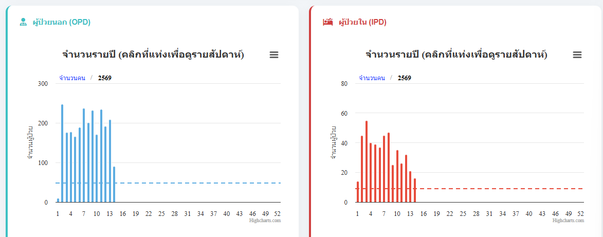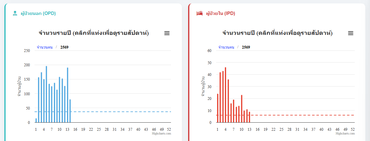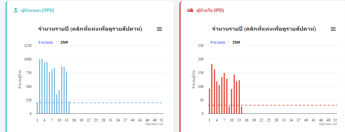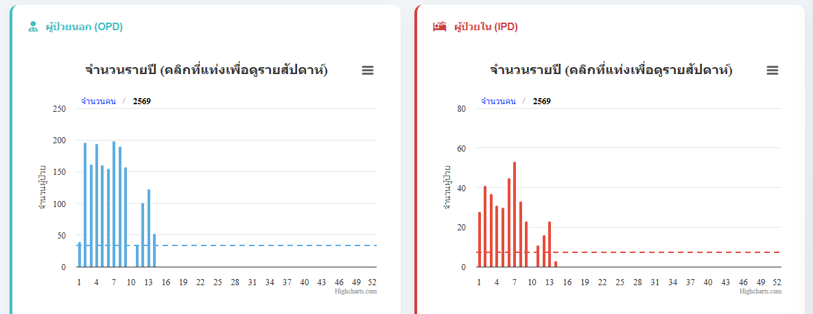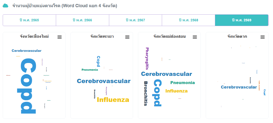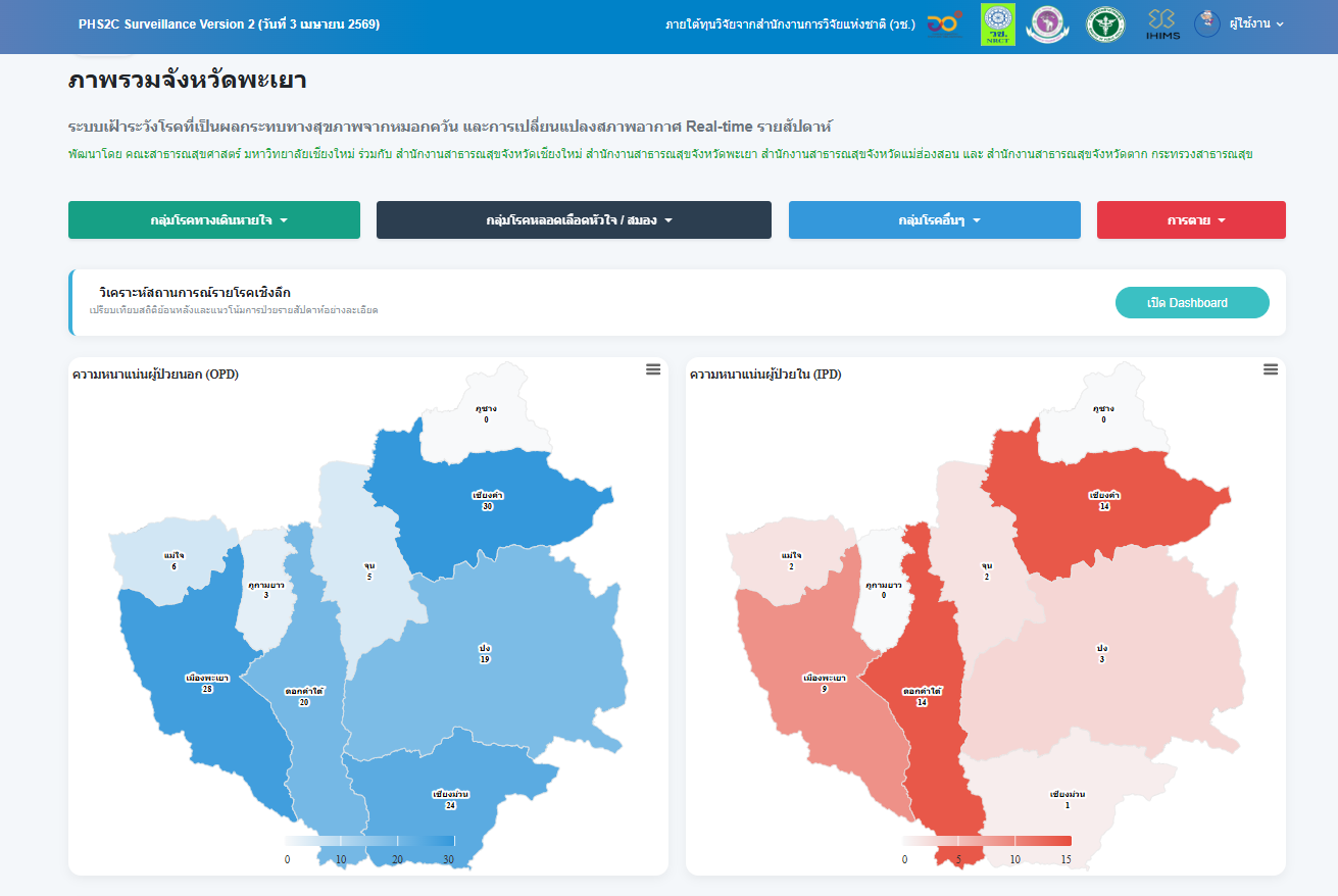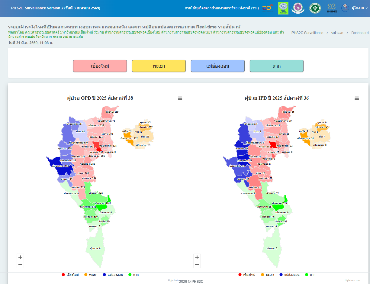 สำหรับ โครงการวิจัยพัฒนาระบบเฝ้าระวังโรคที่เป็นผลกระทบจากปัญหาหมอกควันและการเปลี่ยนแปลงสภาพอากาศ แบบเป็นปัจจุบัน (Realtime) (ระยะที่ 2) ได้รับทุนวิจัยสนับสนุนต่อเนื่องจากทาง วช. โดยมีการขอขยายเพิ่มเติมในพื้นที่อีก 3 จังหวัดในเขตภาคเหนือ โดยทำความร่วมมือกับท่านนายแพทย์สาธารณสุขและทีมงานของสำนักงานสาธารณสุขจังหวัด พะเยา แม่ฮ่องสอน และตาก ที่เข้าร่วมในการพัฒนาระบบเฝ้าระวังโรคที่เกี่ยวข้องกับมลภาะวทางอากาศในการขยายในระยะที่ 2 นี้ สำหรับกลุ่มโรคที่ได้มีการติดตามเฝ้าระวังในระยะที่ 2 ได้แก่ กลุ่มโรคในระบบทางเดินหายใจ อาทิเช่น โรคปอดอุดกั้นเรื้อรัง หรือ COPD โรคปอดอักเสบ โรคหอบหืด โรคหลอดลมอักเสบ รวมถึงโรคไข้หวัดใหญ่ กลุ่มโรคระบบหัวใจและหลอดเลือดสมอง และโรคอื่น ๆ ที่เกี่ยวข้อง โดยการแสดงผลสถิติการเจ็บป่วยด้วยโรคต่าง ๆ ที่มีการเฝ้าระวัง สามารถแสดงผลแยกในแต่ละจังหวัด เชียงใหม่ พะเยา แม่ฮ่องสอน และตาก สามารถแสดงผลย้อนหลังไปได้ประมาณ 4-5 ปีขึ้นกับความสมบูรณ์ของระบบข้อมูลย้อนหลังและช้อมูลที่ใหลเข้ามาอย่างต่อเนื่องมาจนถึงสถานการณ์ในปัจจุบัน แสดงผลรวมจำนวนสถิติผู้ป่วยแต่ละโรคเป็นรายสัปดาห์ ซึ่งหากเข้าไปเลือกดูรายโรค เช่น โรคปอดอุดกั้นเรื้อรัง จะมีปริมาณจำนวนครั้งของผู้ป่วยนอกและผู้ป่วยใน ที่สูงที่สุดเมื่อเทียบกับโรคอื่น ๆ ที่อยู่ในการเฝ้าระวัง ในแต่ละปีที่ผ่านมาในทั้ง 4 จังหวัด โดยเฉพาะในช่วงที่มีฝุ่น PM 2.5 สูงมาก ๆ ในช่วงเดือนกุมภาพันธ์ถึงเดือนพฤษภาคม ในบางปี เช่นปี พ.ศ. 2566 และ 2567 ที่มีสถานการณ์หมอกควันในช่วงฤดูร้อนค่อนข้างรุนแรง จะพบการเพิ่มจำนวนของผู้ป่วยโรคปอดอุดกั้นเรื้อรังที่มีอาการกำเริบเข้ามารับการรักษาจากทางโรงพยาบาลในแต่ละจังหวัดเพิ่มสูงขึ้นอย่างชัดเจนทั้งผู้ป่วยนอกและผู้ป่วยใน และอีกโรคที่พบว่า มีสถิติจำนวนผู้ป่วยที่เข้ามารับการรักษาค่อนข้างสูงใกล้เคียงกัน ทั้งจำนวนผู้ป่วยนอกและผู้ป่วยใน ได้แก่ โรคหลอดเลือดสมอง หรือ สะโตรก ในช่วง 3-4 ปีที่ผ่านมาเช่นกัน ซึ่งสามารถเข้าเว็บไซท์ไปดู Dashboard เพื่อแสดงผลได้ตามลิ้งค์ https://ph.cmu.ac.th/PHS2C/home/ โดยพร้อมเปิดให้ใช้งานแสดงผลการติดตามสถานการณ์โรคที่อยู่ในระบบการเฝ้าระวังในทั้ง 4 จังหวัดได้ตั้งแต่วันที่ 3 เมษายน พ.ศ. 2569 เป็นต้นไป