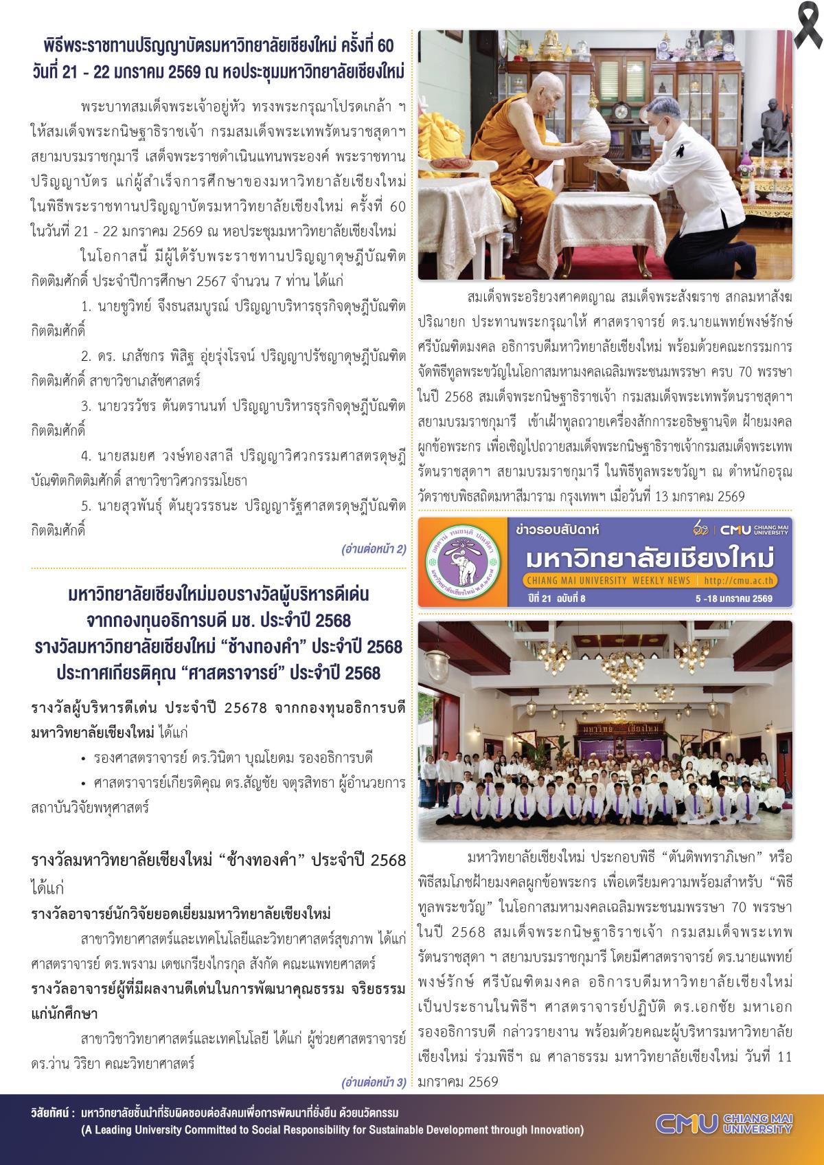 มหาวิทยาลัยเชียงใหม่มุ่งสร้างองค์ความรู้และนวัตกรรมที่ทันสมัย พร้อมพัฒนากำลังคนคุณภาพสูง เพื่อตอบโจทย์การเปลี่ยนแปลงของโลก และขับเคลื่อนสังคมสู่อนาคตที่ยั่งยืนด้วยวิทยาการและภูมิปัญญาที่ผสมผสานระหว่างเทคโนโลยีล้ำสมัยกับรากฐานทางวัฒนธรรมที่เข้มแข็ง