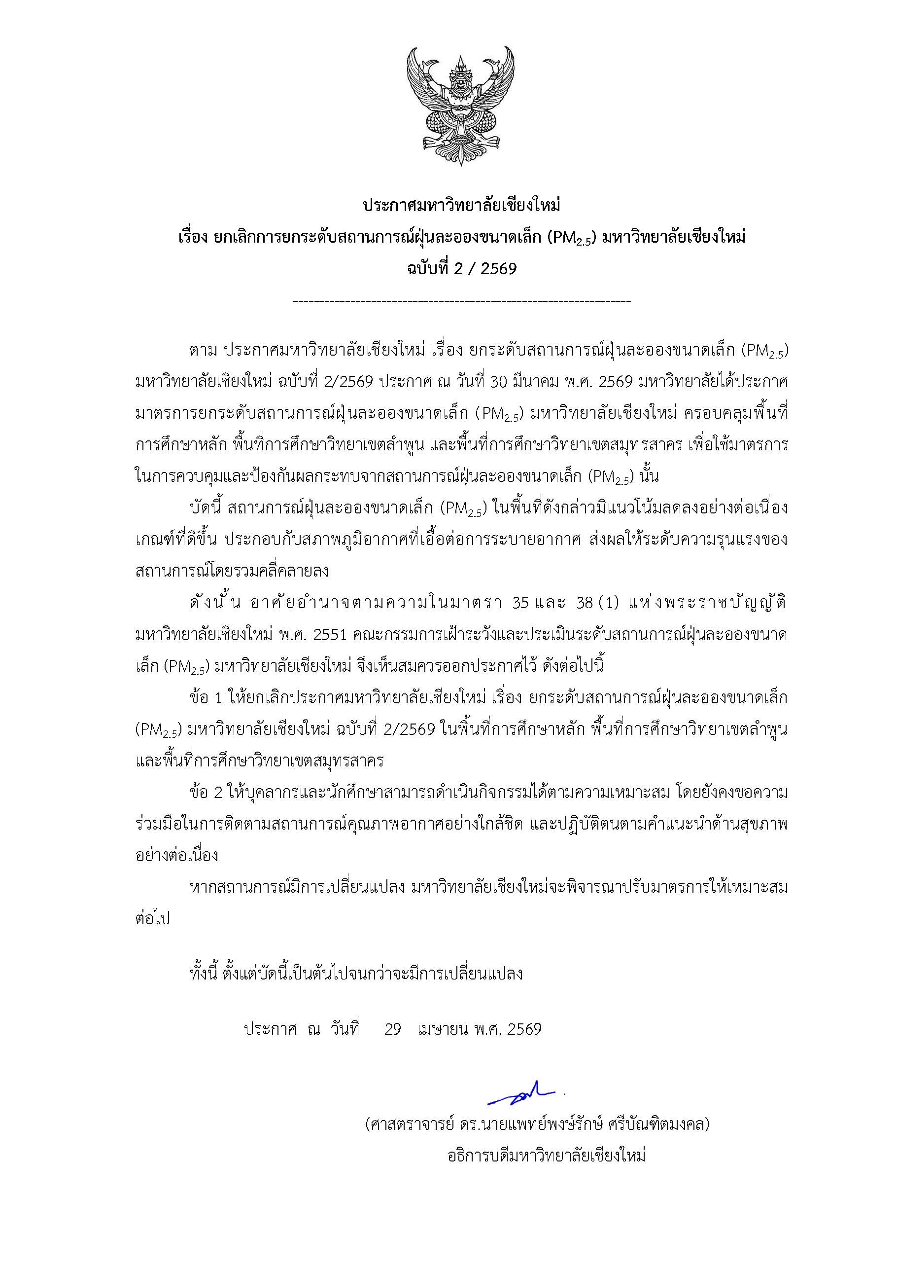 ประกาศ มช. เรื่อง ยกเลิกการยกระดับสถานการณ์ฝุ่นละอองขนาดเล็ก (PM2.5) มหาวิทยาลัยเชียงใหม่ ฉบับที่ 2 / 2569