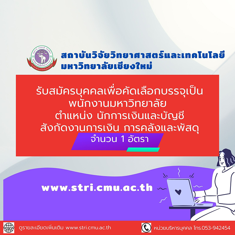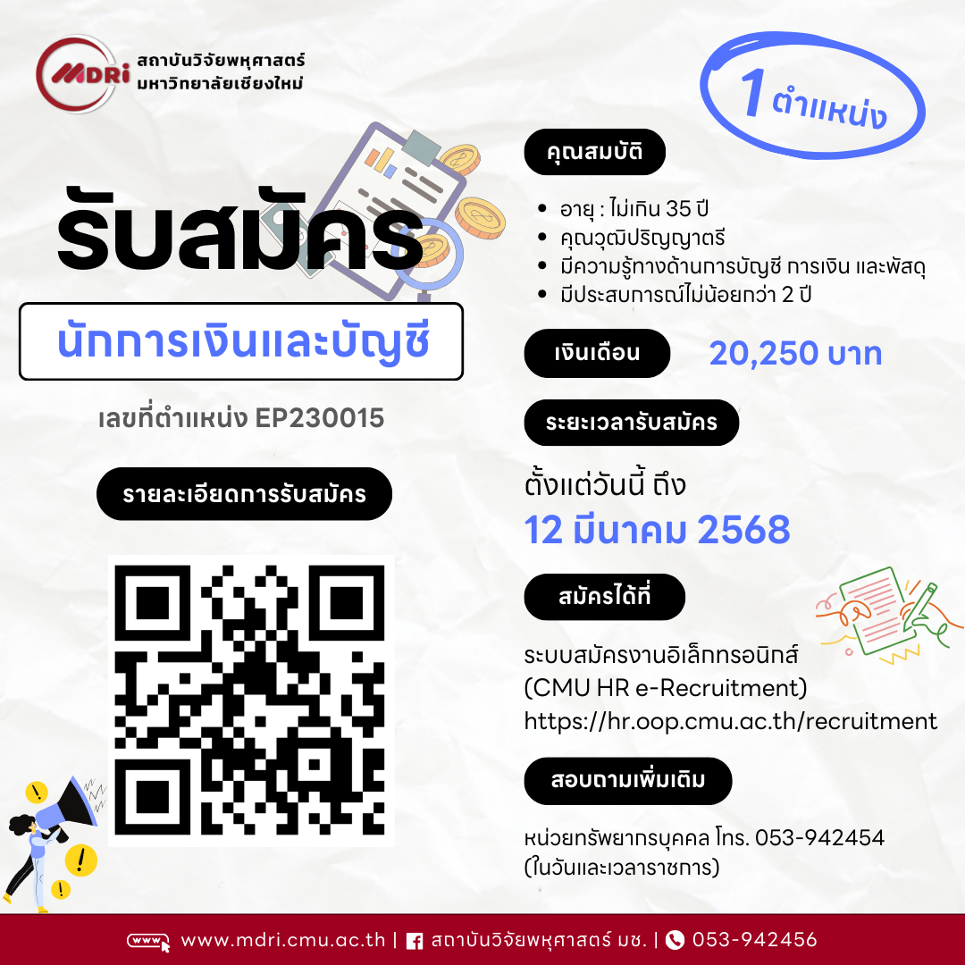 สถาบันวิจัยพหุศาสตร์ มหาวิทยาลัยเชียงใหม่ ประกาศรับสมัครบุคคลเพื่อคัดเลือกเป็นพนักงานมหาวิทยาลัย แบบเพิ่มศักยภาพ ตำแหน่งนักการเงินและบัญชี จำนวน 1 อัตรา