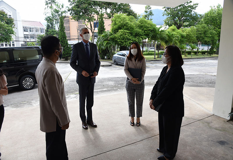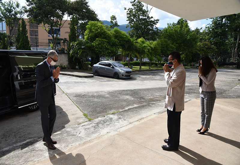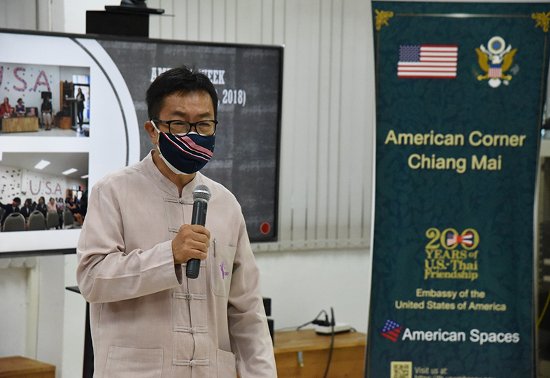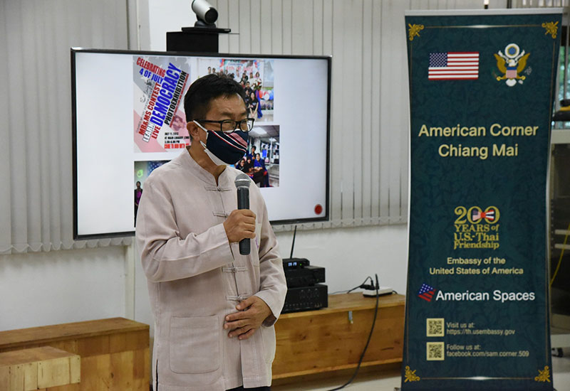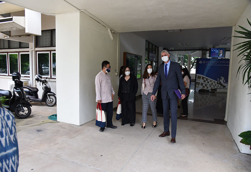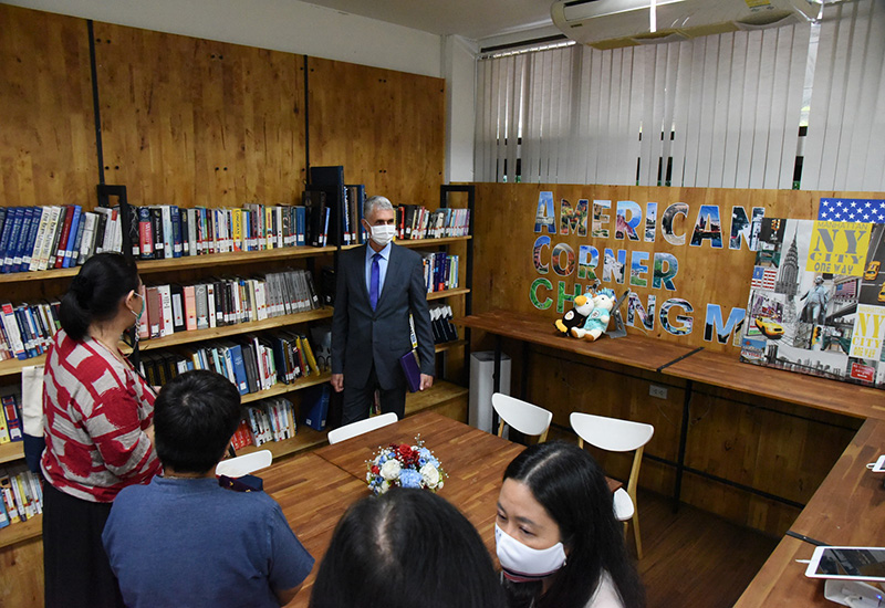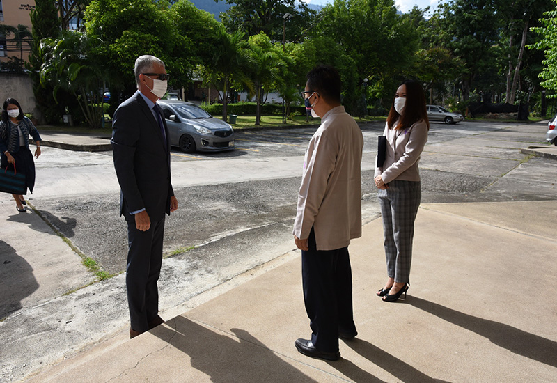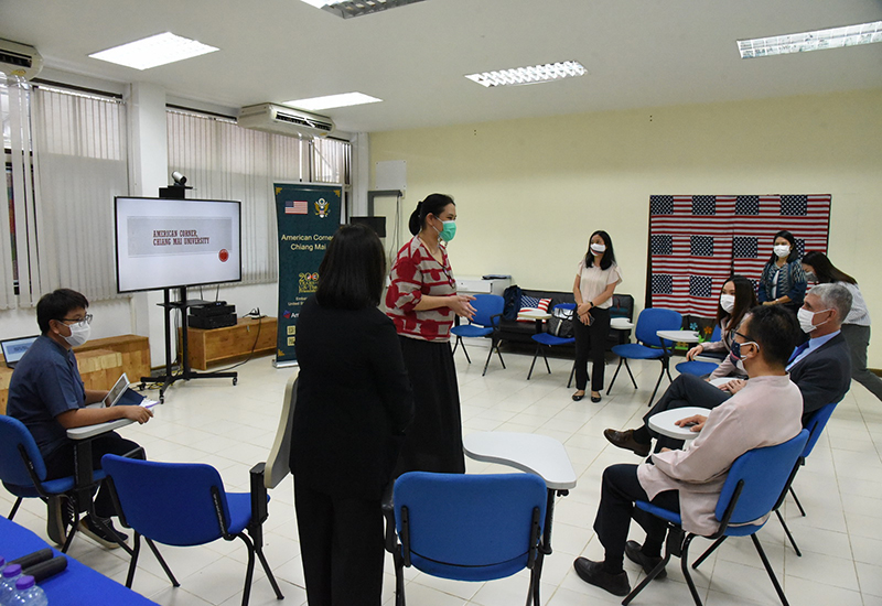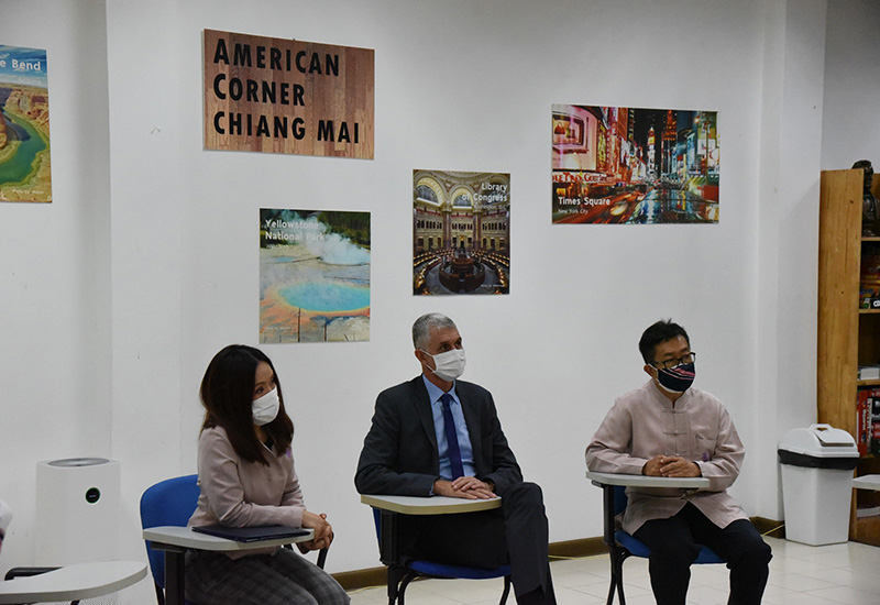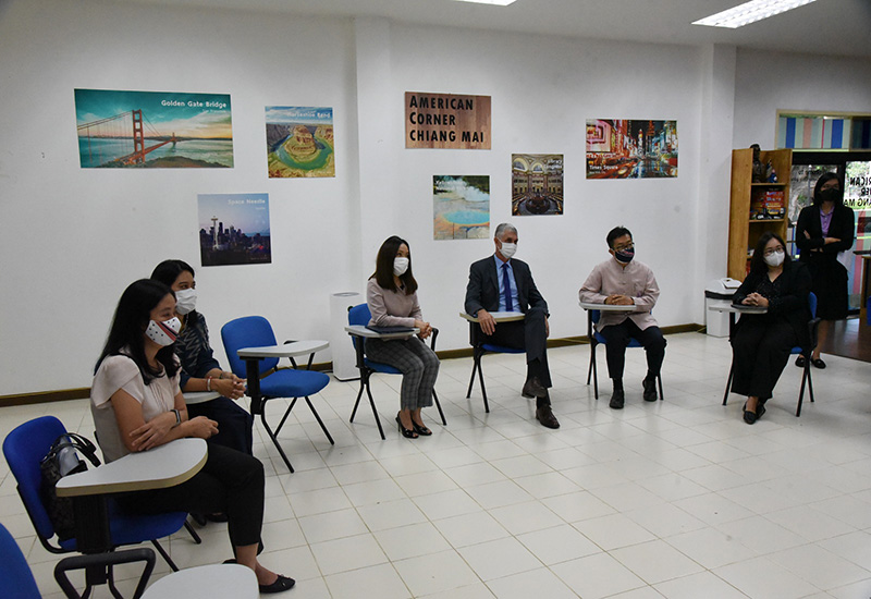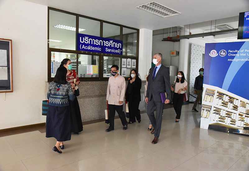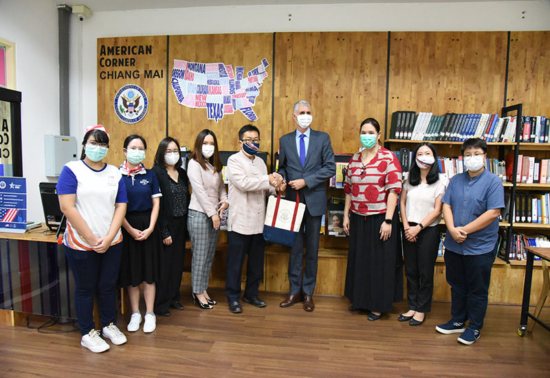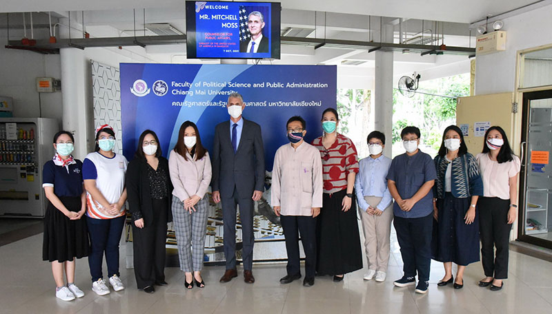รองศาสตราจารย์โรม จิรานุกรม รองอธิการบดีมหาวิทยาลัยเชียงใหม่ ต้อนรับ Mr. Mitchell Moss ที่ปรึกษาฝ่ายสื่อมวลชนและวัฒนธรรม สถานทูตสหรัฐอเมริกา ประจำประเทศไทย ในโอกาสเดินทางมาเยี่ยมชม American Corner คณะรัฐศาสตร์และรัฐประศาสนศาสตร์ มหาวิทยาลัยเชียงใหม่ โดยมี ผู้ช่วยศาสตราจารย์ ดร. ไพลิน ภู่จีนาพันธุ์ คณบดี พร้อมด้วยคณะผู้บริหารและเจ้าหน้าที่ ร่วมต้อนรับ ณ ห้อง American Corner ชั้น 1 คณะรัฐศาสตร์และรัฐประศาสนศาสตร์ วันพฤหัสบดีที่ 7 ตุลาคม พ.ศ. 2564