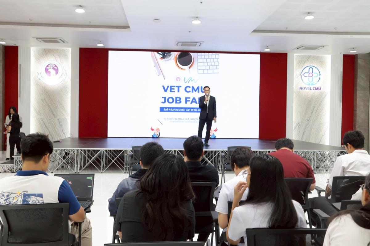 เมื่อวันที่ 9 ธันวาคม พ.ศ. 2568 รศ. ดร. น.สพ.ธวัชชัย สิงห์หล้า ผู้ช่วยคณบดีฝ่ายศิษย์เก่าและนักศึกษาสัมพันธ์ คณะสัตวแพทยศาสตร์ มหาวิทยาลัยเชียงใหม่ ร่วมกับคณาจารย์จากสำนักวิชาสัตวแพทยศาสตร์ และทีมงานบริการการศึกษาและพัฒนาคุณภาพนักศึกษา ได้จัดกิจกรรม ตลาดนัดวิชาชีพทางสัตวแพทย์ (Job and Education Fair 2025) เพื่อส่งเสริมการเตรียมความพร้อมด้านอาชีพให้แก่นักศึกษาสัตวแพทย์ โดยเปิดโอกาสให้นักศึกษาชั้นปีที่ 5 และนักศึกษาที่สนใจ พบปะและพูดคุยกับสถานประกอบการสำหรับการฝึกปฏิบัติงานและสหกิจศึกษา ทั้งนี้ กิจกรรมได้รับการตอบรับอย่างดีจากสถานพยาบาลสัตว์ ผู้ประกอบการฟาร์มปศุสัตว์ บริษัทเอกชน และสถานประกอบการที่มีความต้องการสัตวแพทย์ มากกว่า 39 แห่งทั่วประเทศ ที่เข้าร่วมงาน ณ อาคารศูนย์การเรียนรู้และส่งเสริมสุขภาพทางสัตวแพทย์ภาคเหนือ (NOVEL CMU) คณะสัตวแพทยศาสตร์ มหาวิทยาลัยเชียงใหม่