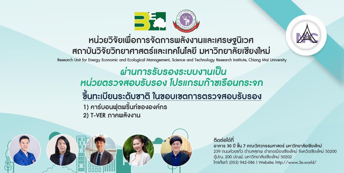 สำนักงานมาตรฐานผลิตภัณฑ์อุตสาหกรรม ได้ดำเนินการพิจารณาและมีมติอนุมัติให้การรับรองระบบงานหน่วยตรวจสอบความใช้ได้และทวนสอบก๊าซเรือนกระจกให้แก่ หน่วยวิจัยเพื่อการจัดการพลังงานและเศรษฐนิเวศ สถาบันวิจัยวิทยาศาสตร์และเทคโนโลยี มหาวิทยาลัยเชียงใหม่ โดยขอบข่ายที่ได้รับการรับรองระบบงาน ได้แก่ 1) ขอบข่ายการทวนสอบคาร์บอนฟุตพริ้นท์ขององค์กรตามแนวทางการทวนสอบคาร์บอนฟุตพริ้นท์ขององค์การบริหารจัดการก๊าซเรือนกระจก (องค์การมหาชน) (ISO 14064-1:2006) ได้แก่ สาขาการผลิตพลังงานและการจัดการพลังงานไฟฟ้า สาขาอุตสาหกรรมการผลิตทั่วไป สาขาการสำรวจ การผลิต การกลั่นน้ำมันปิโตรเลียมและก๊าซ และการจัดส่งทางท่อ รวมถึงอุตสาหกรรมปิโตรเคมี สาขาอุตสาหกรรมการผลิตเยื่อกระดาษ กระดาษ และการพิมพ์ และ 2) ขอบข่ายการตรวจสอบความใช้ได้และทวนสอบก๊าซเรือนกระจกระดับโครงการลดก๊าซเรือนกระจกภาคสมัครใจตามมาตรฐานของประเทศไทย (ISO 14064-2:2006) ตามแนวทางการตรวจสอบและทวนสอบโครงการลดก๊าซเรือนกระจกภาคสมัครใจตามมาตรฐานของประเทศไทยของค์การบริหารจัดการก๊าซเรือนกระจก (องค์การมหาชน) ได้แก่ สาขาพลังงานภาคอุตสาหกรรม และสาขาความต้องการพลังงาน ทางหน่วยวิจัย ฯ มีบุคลากรที่มีความรู้ความสามารถและขึ้นทะเบียนเป็นผู้ตรวจสอบความใช้ได้และทวนสอบก๊าซเรือนกระจกกับองค์การบริหารจัดการก๊าซเรือนกระจก (องค์การมหาชน) พร้อมให้บริการตรวจสอบความใช้ได้และทวนสอบก๊าซเรือนกระจกแก่องค์กรหรือสถานประกอบการที่สนใจ สามารถติดต่อมายังหน่วยวิจัยฯ ที่ตั้ง ชั้น 7 อาคาร 30 ปี คณะวิศวกรรมศาสตร์ มหาวิทยาลัยเชียงใหม่ หรือโทรศัพท์ 053 942 086 และเว็บไซต์ www.3e.world/post/45