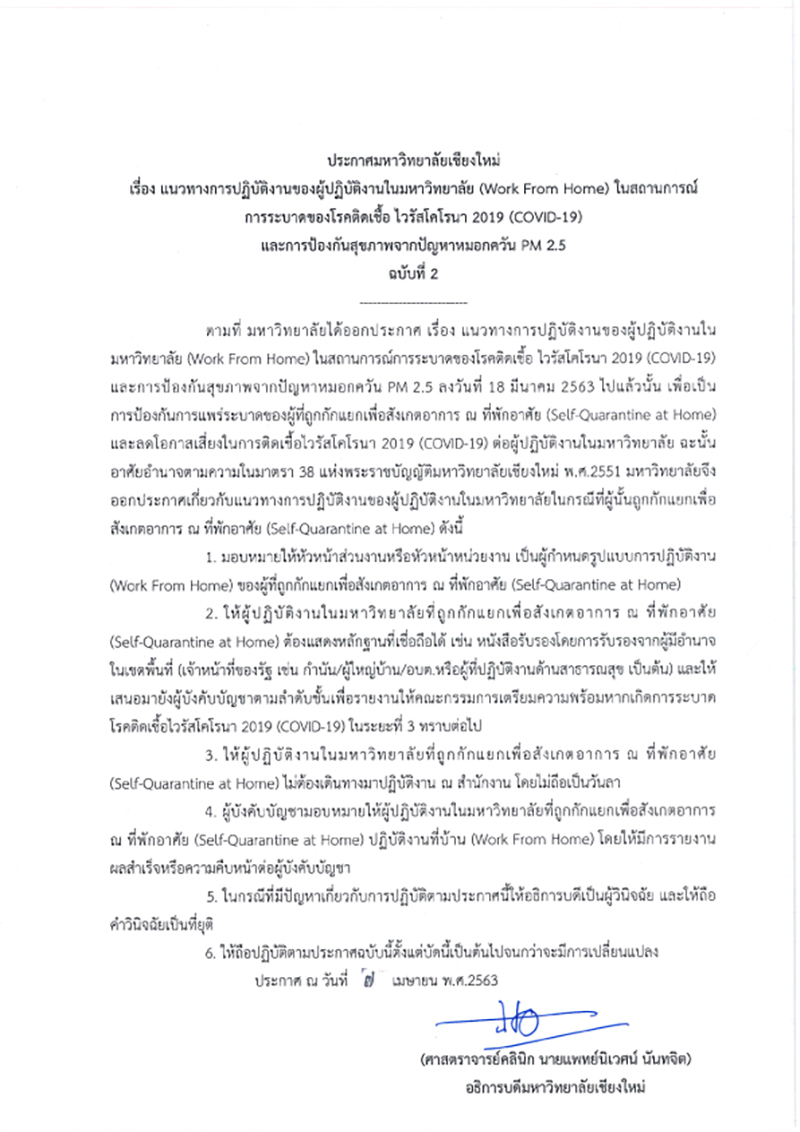 ประกาศมหาวิทยาลัยเชียงใหม่ เรื่องแนวทางการปฏิบัติงานของผู้ปฏิบัติงานในมหาวิทยาลัย (Work From Home) ในสถานการณ์การระบาดของโรคติดเชื้อไวรัสโคโรนา 2019 (COVID-19) และการป้องกันสุขภาพจากปัญหาหมอกควัน PM 2.5 ฉบับที่ 2