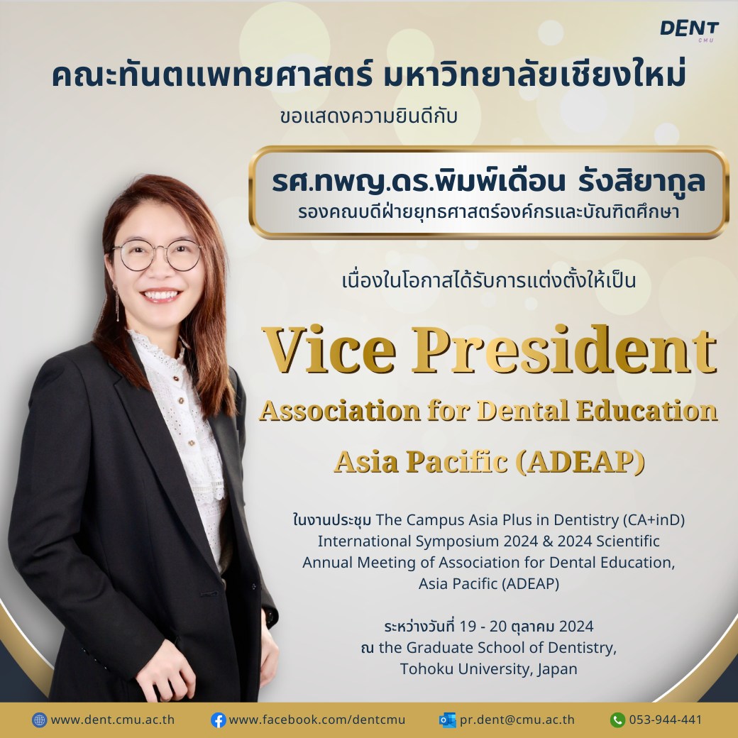 มหาวิทยาลัยเชียงใหม่ ขอแสดงความยินดีกับ รศ.ทพญ.ดร.พิมพ์เดือน รังสิยากูล รองคณบดีฝ่ายยุทธศาสตร์องค์กรและบัณฑิตศึกษา คณะทันตแพทยศาสตร์ มหาวิทยาลัยเชียงใหม่ เนื่องในโอกาสได้รับการแต่งตั้งให้เป็น Vice President Association for Dental Education, Asia Pacific (ADEAP) ในงานประชุม The Campus Asia Plus in Dentistry (CA+inD) International Symposium 2024 & 2024 Scientific Annual Meeting of Association for Dental Education, Asia Pacific (ADEAP) ระหว่างวันที่ 19 - 20 ตุลาคม 2024 ณ the Graduate School of Dentistry, Tohoku University, Japan
