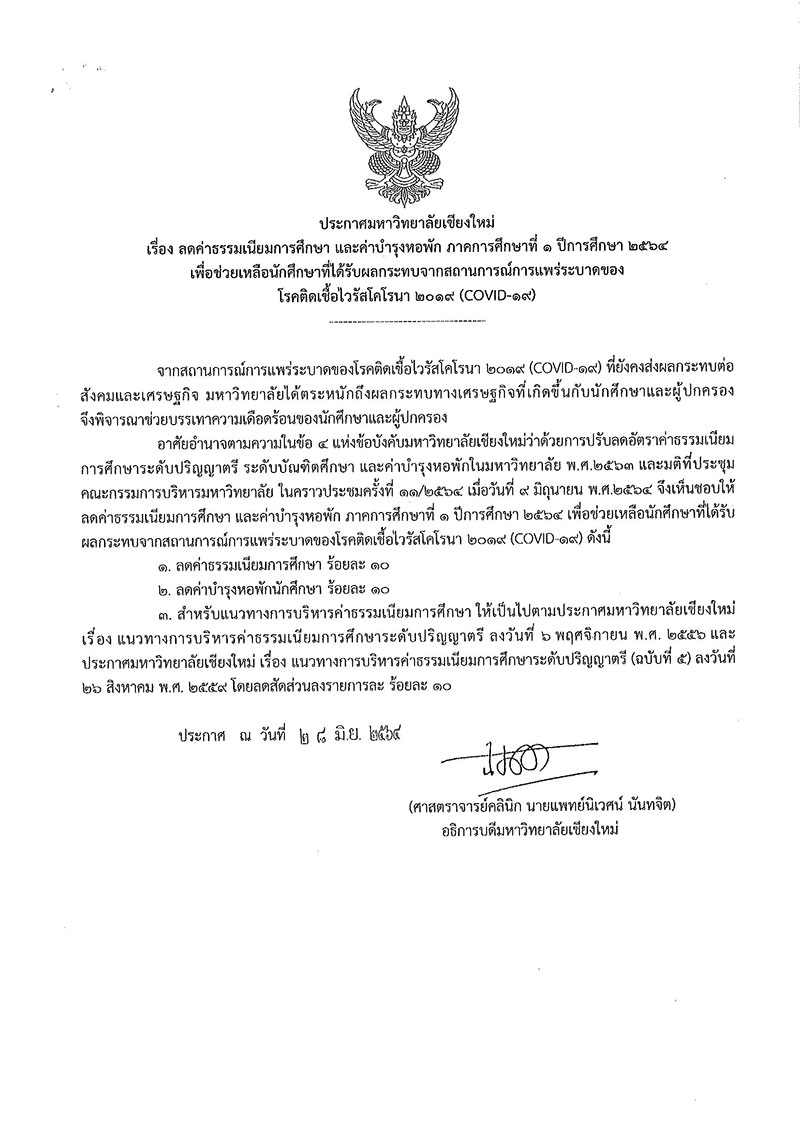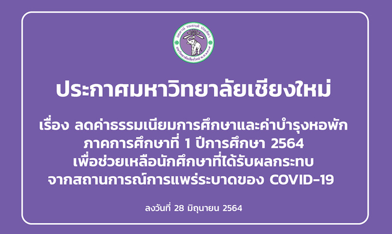 ประกาศ ลดค่าธรรมเนียมการศึกษา และค่าบำรุงหอพัก ภาคการศึกษาที่ 1 ปีการศึกษา 2564 เพื่อช่วยเหลือนักศึกษาที่ได้รับผลกระทบจากสถานการณ์การแพร่ระบาดของ โรคติดเชื้อไวรัสโคโรนา 2019 (COVID-19)