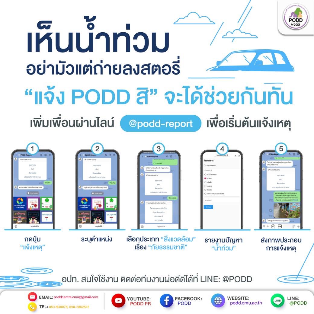 พร้อมกันนี้ ประชาชนสามารถรายงานเหตุการณ์ผ่านระบบ PODD (ผ่อดีดี) โดยแจ้งผ่านไลน์ @podd-report ซึ่งจะส่งต่อข้อมูลไปยังองค์กรปกครองส่วนท้องถิ่นที่เกี่ยวข้อง ทำให้การตอบสนองเป็นไปอย่างรวดเร็วและการช่วยเหลือตรงจุดมากขึ้น