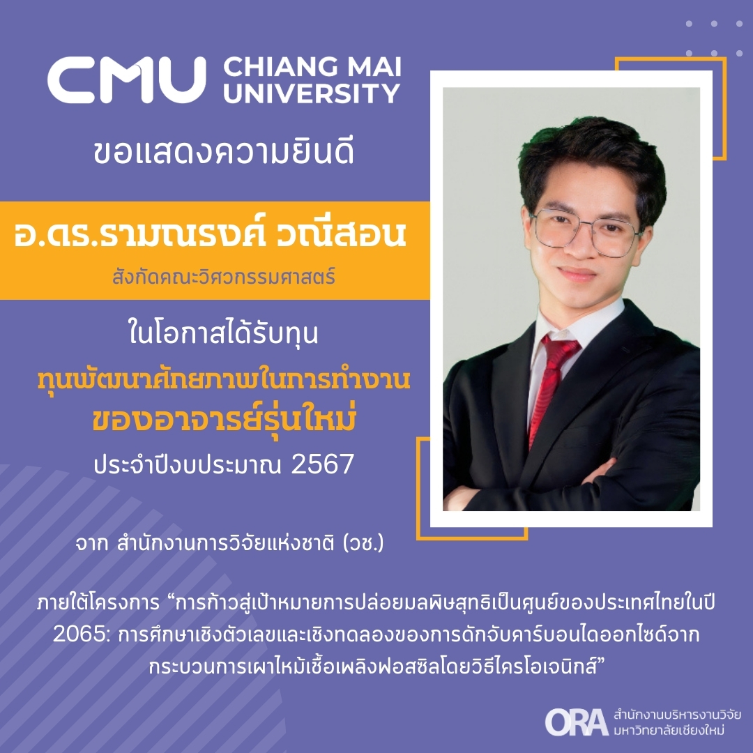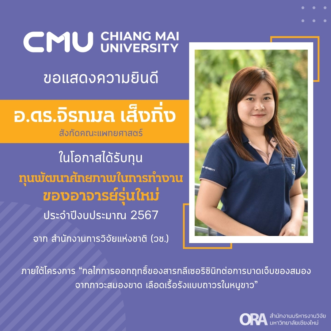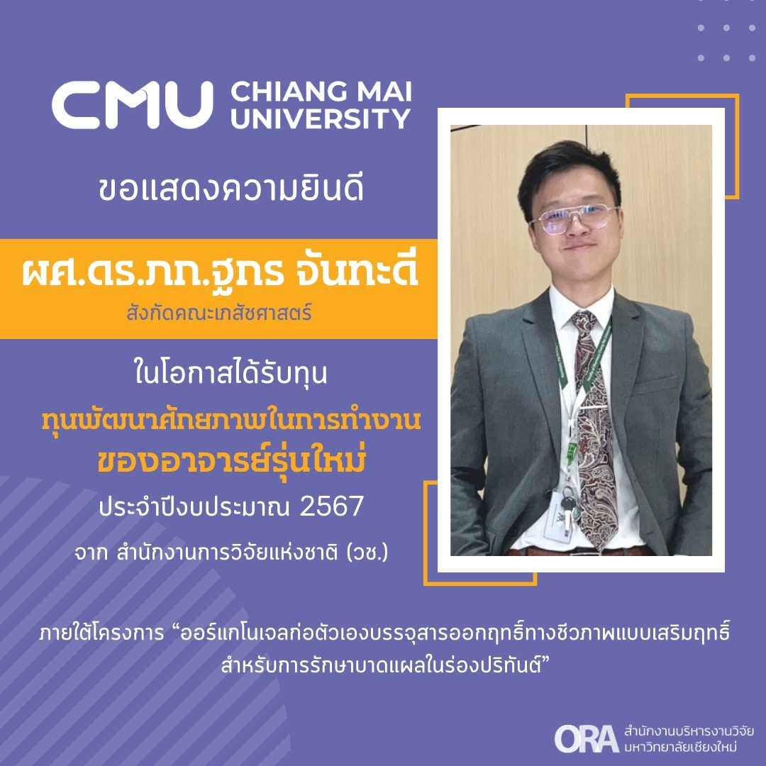 อาจารย์นักวิจัยมหาวิทยาลัยเชียงใหม่ ได้รับทุนสนับสนุนการวิจัยและนวัตกรรม ประจำปี 2567 ด้านการพัฒนาเส้นทางอาชีพนักวิจัยและนวัตกรรม และการวิจัยเพื่อฐานทางวิชาการ “ทุนพัฒนาศักยภาพในการทำงานวิจัยของอาจารย์รุ่นใหม่” จากสำนักงานการวิจัยแห่งชาติ (วช.) ดังนี้