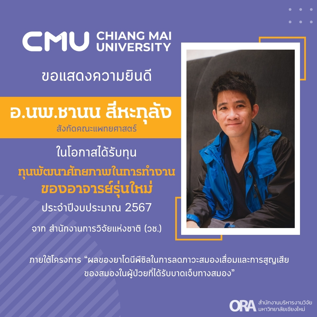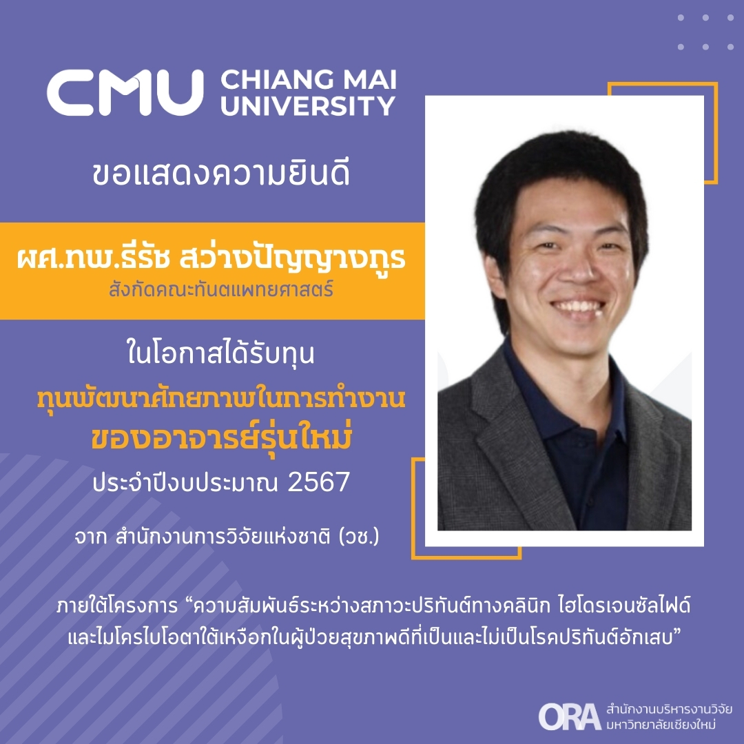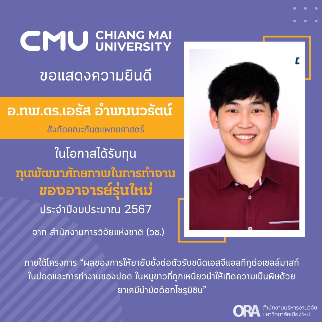 อาจารย์นักวิจัยมหาวิทยาลัยเชียงใหม่ ได้รับทุนสนับสนุนการวิจัยและนวัตกรรม ประจำปี 2567 ด้านการพัฒนาเส้นทางอาชีพนักวิจัยและนวัตกรรม และการวิจัยเพื่อฐานทางวิชาการ “ทุนพัฒนาศักยภาพในการทำงานวิจัยของอาจารย์รุ่นใหม่” จากสำนักงานการวิจัยแห่งชาติ (วช.) ดังนี้