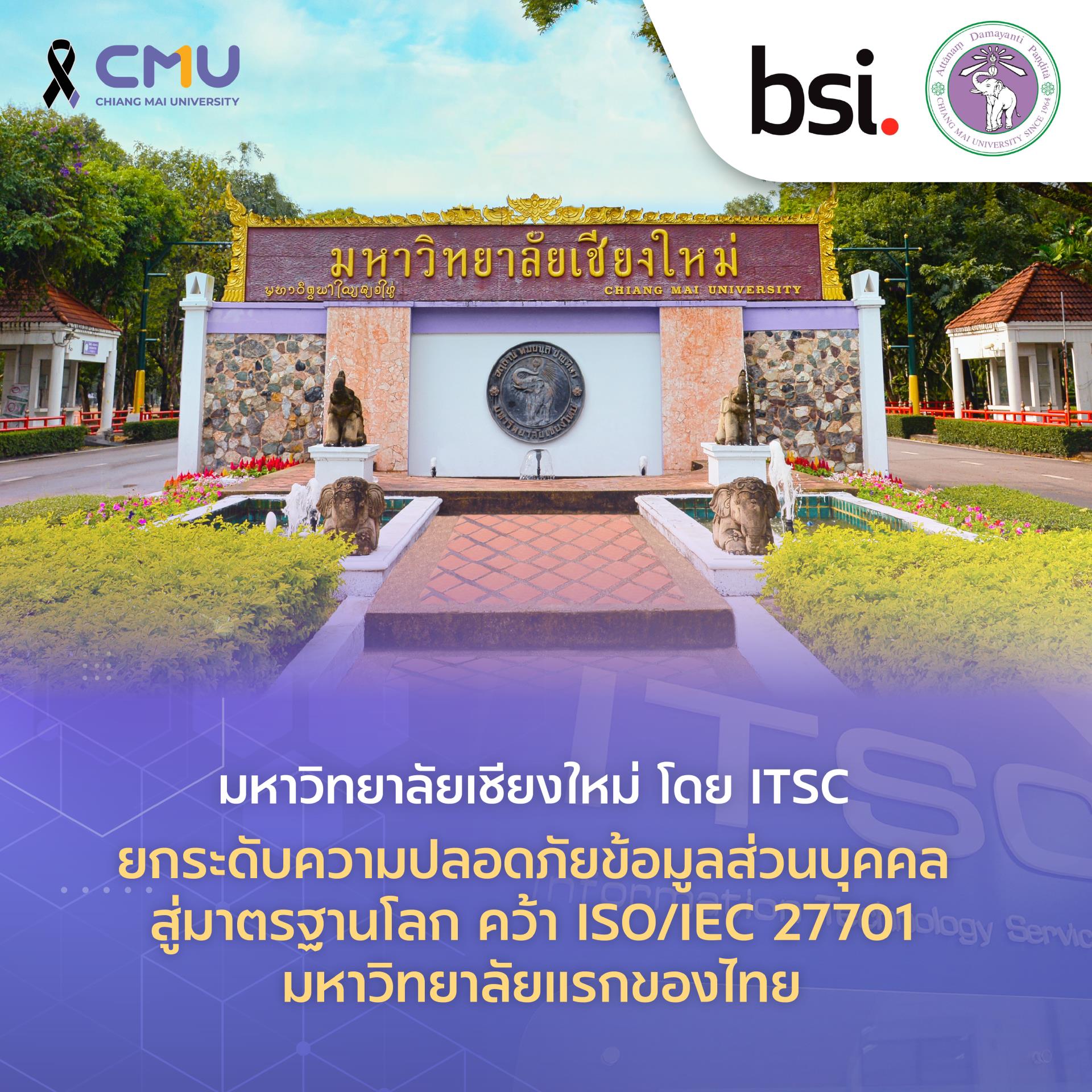 มหาวิทยาลัยเชียงใหม่ โดย สำนักบริการเทคโนโลยีสารสนเทศ (Information Technology Service Center: ITSC) เดินหน้าพัฒนาระบบบริหารจัดการข้อมูลส่วนบุคคลอย่างต่อเนื่อง ล่าสุดได้รับการรับรองมาตรฐานสากล ISO/IEC 27701 (Privacy Information Management System: PIMS) เป็นมหาวิทยาลัยแรกของประเทศไทย เมื่อวันที่ 4 เมษายน พ.ศ. 2569 สะท้อนความพร้อมของมหาวิทยาลัยในการบริหารจัดการข้อมูลส่วนบุคคลตามหลักสากลอย่างครบวงจร และยกระดับมาตรฐานความน่าเชื่อถือด้านเทคโนโลยีสารสนเทศในระดับนานาชาติ