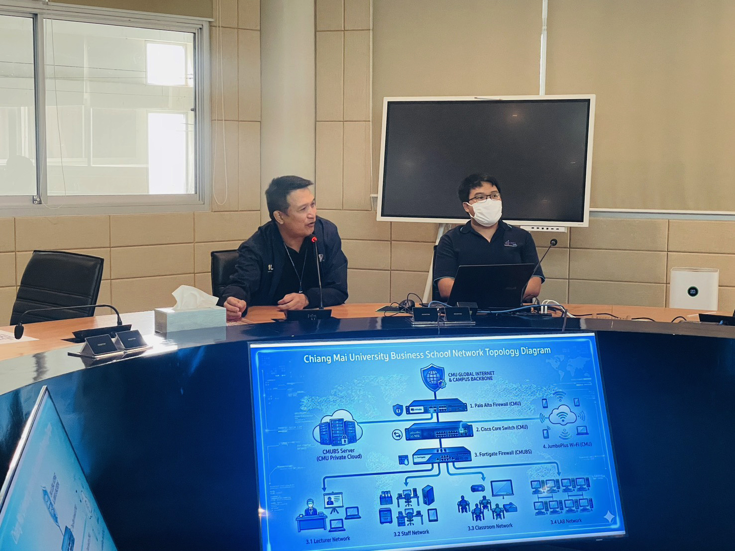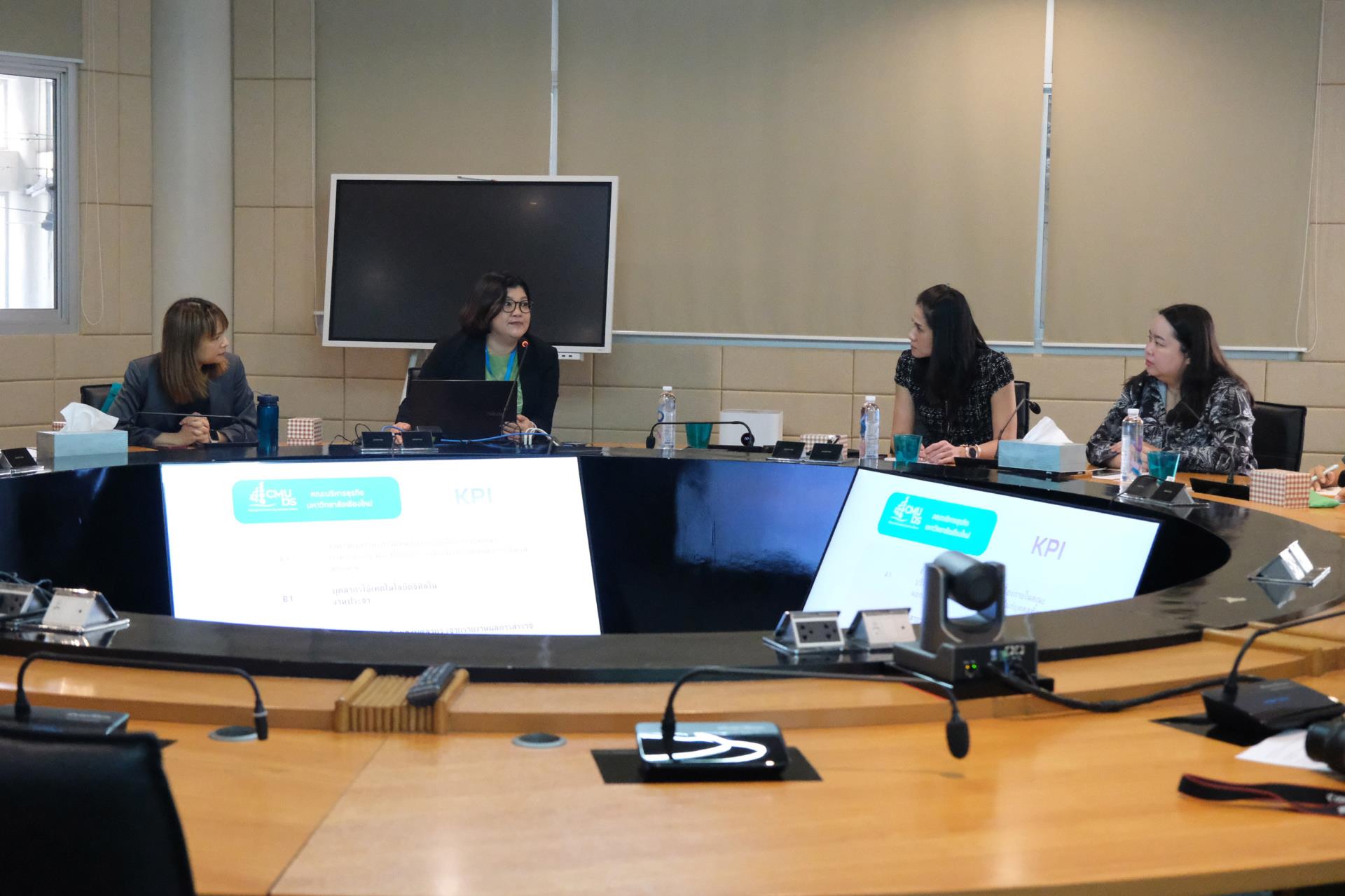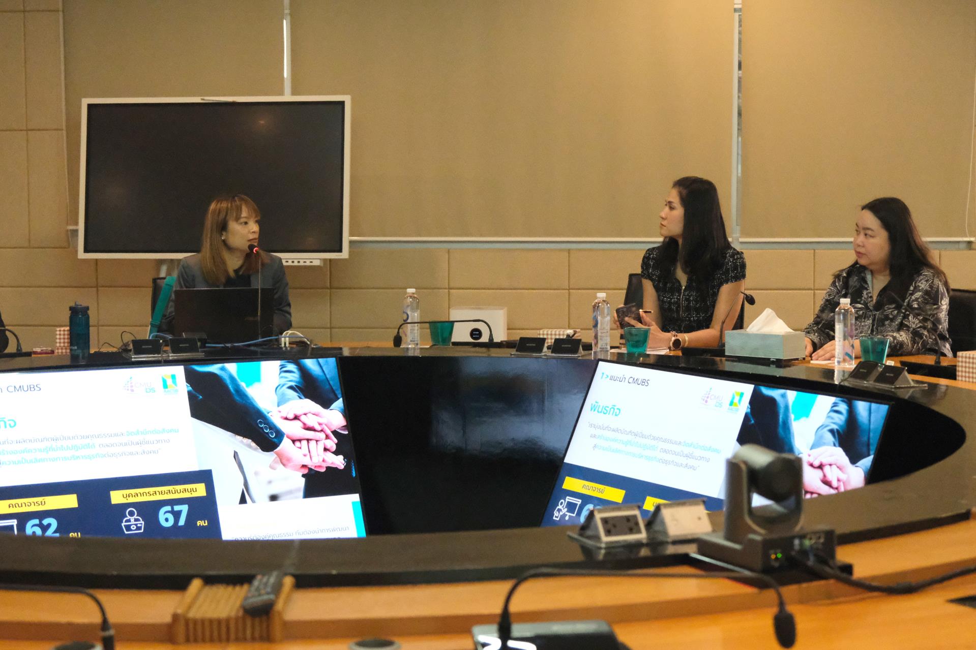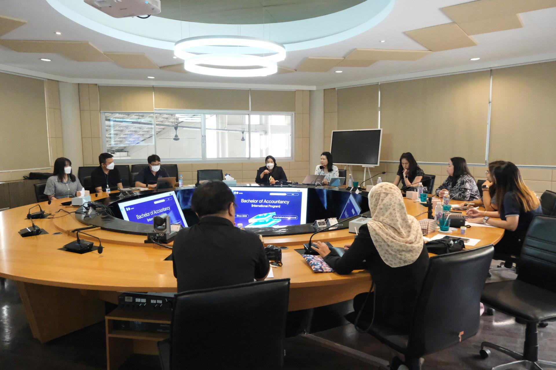 ในการนี้ ผศ. ดร.สายนที เฉินบำรุง รองคณบดีคณะบริหารธุรกิจ มหาวิทยาลัยเชียงใหม่ ให้เกียรติกล่าวต้อนรับ ผศ. ดร.ณติกา ไชยานุพงศ์ ผู้อำนวยการหลักสูตรฯ พร้อมด้วยผู้บริหารหลักสูตรและคณะผู้ติดตาม ณ ห้องประชุมหกเหลี่ยม คณะบริหารธุรกิจ มหาวิทยาลัยเชียงใหม่ โดยบรรยายภาพรวมของคณะฯ ผศ. ดร.ปิติมา ดิศกุลเนติวิทย์ ประธานหลักสูตรบัญชีบัณฑิต (หลักสูตรนานาชาติ) นำเสนอแนวทางการบริหารจัดการหลักสูตร รวมถึงการประชาสัมพันธ์หลักสูตร จากนั้น คุณฐิตารีย์ ยิ้มประเสริฐ หัวหน้างานบริหารทั่วไป ถ่ายทอดประเด็นการพัฒนาบุคลากร คุณเทวัญ ทองทับ และคุณนวนนท์ วงค์สุวรรณ์ บุคลากรจากงานพัฒนาและขับเคลื่อนยุทธศาสตร์ร่วมบรรยาย ข้อมูลด้านโครงสร้างพื้นฐานและระบบเทคโนโลยีสารสนเทศ โดยทั้งสองฝ่ายได้ร่วมแลกเปลี่ยนความคิดเห็นและประสบการณ์เพื่อการเรียนรู้ตลอดการบรรยาย