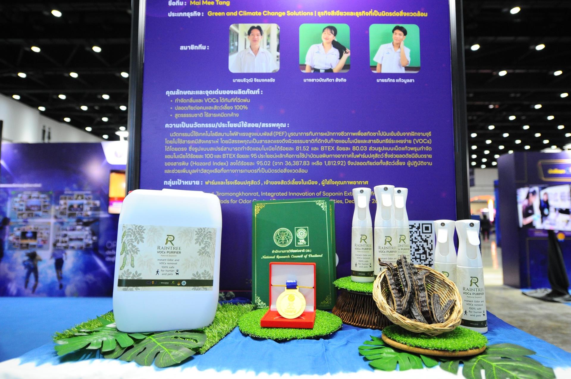 ผลงาน “RainTree VOCs Purifier” เป็นนวัตกรรมเครื่องฟอกอากาศที่พัฒนาจาก “ฝักจามจุรี” โดยนำวัสดุชีวภาพจากธรรมชาติมาต่อยอดเป็นสเปรย์และเม็ดกรองอากาศที่สามารถดูดซับสารอินทรีย์ระเหยง่าย (VOCs) ซึ่งเป็นมลพิษทางอากาศที่ส่งผลต่อสุขภาพ