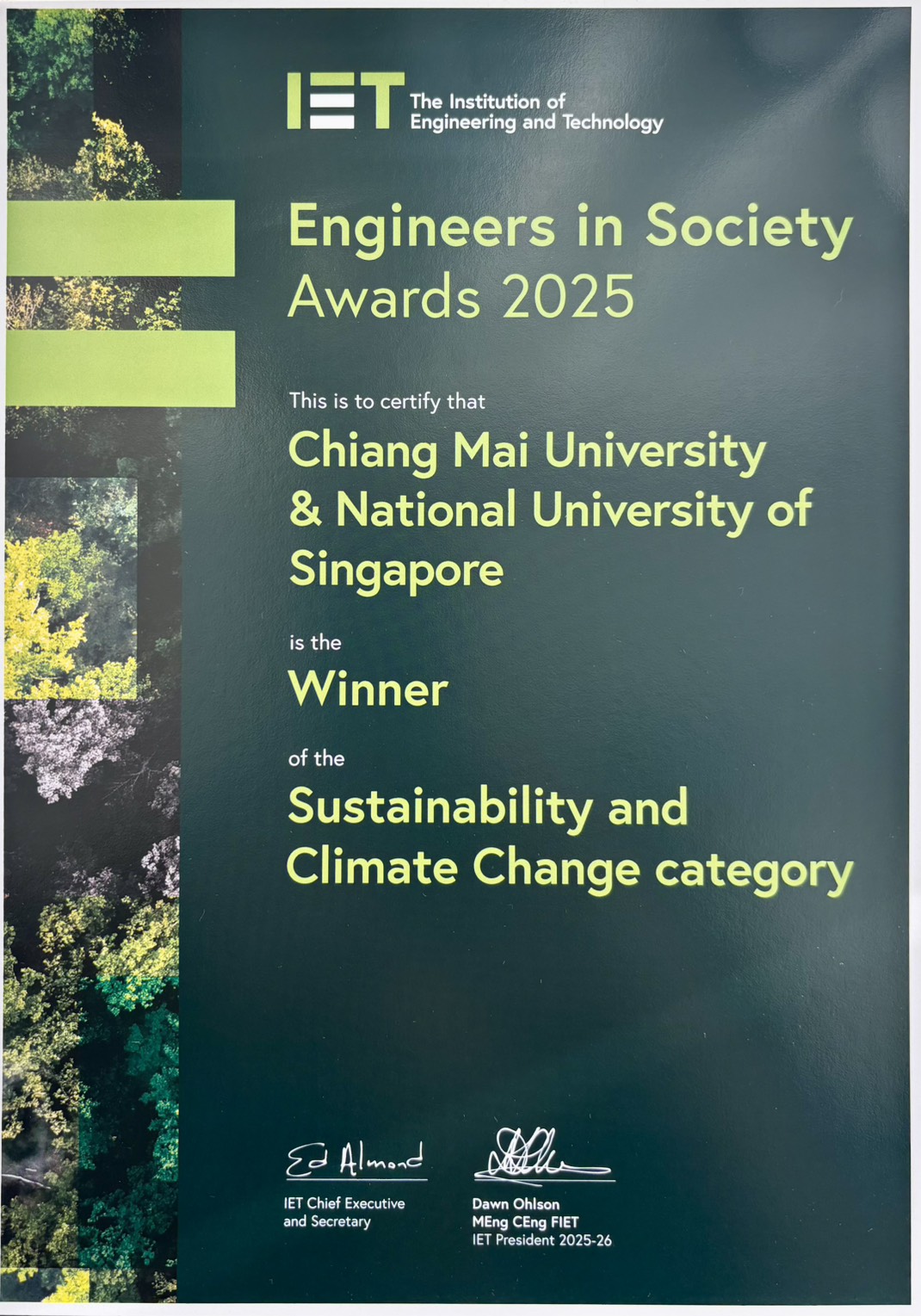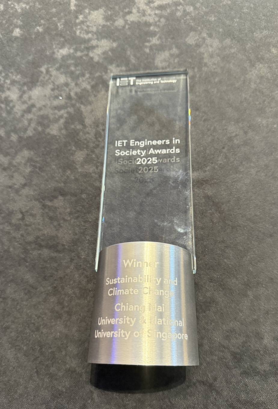 รางวัล IET Engineers in Society Awards ถือเป็นรางวัลระดับนานาชาติที่ทรงเกียรติ มอบให้กับผลงานที่มี ผลกระทบต่อสังคม (Societal Impact) และเน้น การทำงานร่วมกัน (Collaboration) โดยทีม CMU–NUS เป็นผู้ชนะเลิศหนึ่งเดียวในหมวด Sustainability & Climate ของปีนี้