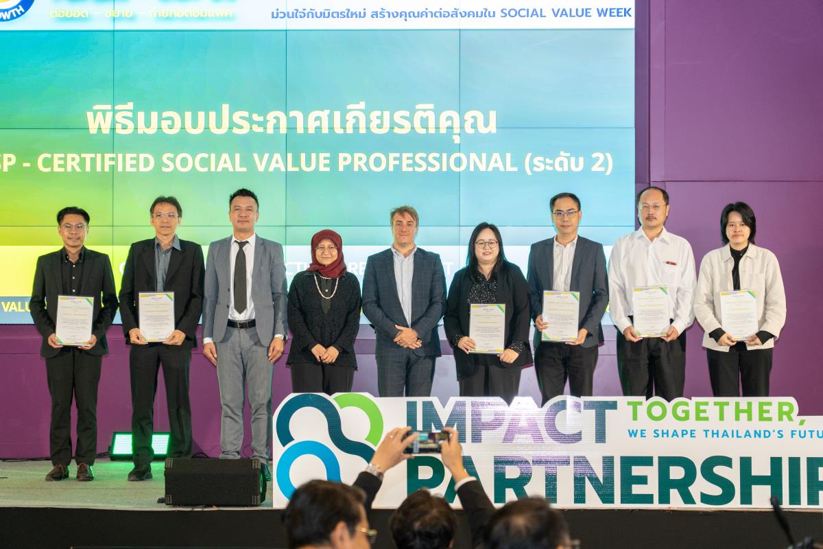 ต่อด้วยการแถลงยุทธศาสตร์ความร่วมมือ SVA Impact Partnership โดย ดร.สกฤกทิพย์ กรีฑาพิษวงศ์ กรรมการและเลขานุการสมาคมผู้ประเมินคุณค่าทางสังคมไทย และการประกาศความร่วมมือด้าน Social Value Accelerator จากเครือข่าย SVA ทั่วประเทศ รวมถึงพิธีมอบประกาศเกียรติคุณให้แก่ผู้ที่ผ่านการรับรอง Certified Social Value Professional (CSP) ระดับ 2 และการเสวนาวิชาการหัวข้อ “จากวิกฤติสู่โอกาส: บทบาทมหาวิทยาลัยไทยในการแก้ไขวิกฤติและสร้างคุณค่าอย่างยั่งยืน (Transforming Higher Education for National Resilience and Social Value)”