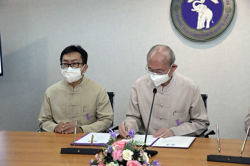 รองอธิการบดี และคณะผู้บริหารมหาวิทยาลัยเชียงใหม่ และ ดร.สถิตย์ ลิ่มพงศ์พันธุ์ ประธานสถาบันวิจัยและพัฒนาการเศรษฐกิจการพาณิชย์ พร้อมด้วย นางนที ชวนสนิท เลขาธิการมูลนิธิสถาบันวิจัยและพัฒนาเศรษฐกิจการพาณิชย์ และคณะสถาบันวิจัยและพัฒนาเศรษฐกิจการพาณิชย์ (IBERD) ร่วมลงนามฯ ภายใต้ความร่วมมือของสำนักงานบริหารงานวิจัย มหาวิทยาลัยเชียงใหม่