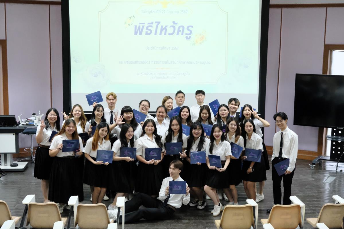 วันที่ 27 มิถุนายน 2567 งานพัฒนาคุณภาพนักศึกษาและศิษย์เก่าสัมพันธ์ คณะบริหารธุรกิจ จัดพิธีไหว้ครูคณะบริหารธุรกิจ ประจำปีการศึกษา 2567 โดยมีตัวแทนนักศึกษาระดับชั้นปริญญาตรีแต่ละชั้นปีและนักศึกษาระดับปริญญาโทในแต่ละโครงการฯ ร่วมถือพานในพิธี เพื่อแสดงความเคารพน้อมรำลึกถึงพระคุณครูอาจารย์ อันเป็นการสืบสานขนบธรรมเนียมวัฒนธรรมอันดีงามของไทย ในการนี้ ผศ.ดร.ก้องภูนิมานันท์ คณบดีคณะบริหารธุรกิจ มหาวิทยาลัยเชียงใหม่ ให้เกียรติเป็นประธานในพิธี ณ ห้องประชุม 1 คณะบริหารธุรกิจ มหาวิทยาลัยเชียงใหม่ โดยภายในพิธีมีการมอบพานไหว้ครู การรับฟังโอวาทจากคณบดีฯ การรับมอบเกียรติบัตรแก่กรรมการสโมสรนักศึกษา ก่อนปิดท้ายด้วยการร่วมร้องเพลงอย่างพร้อมเพรียงกันท่ามกลางบรรยากาศที่อบอุ่น