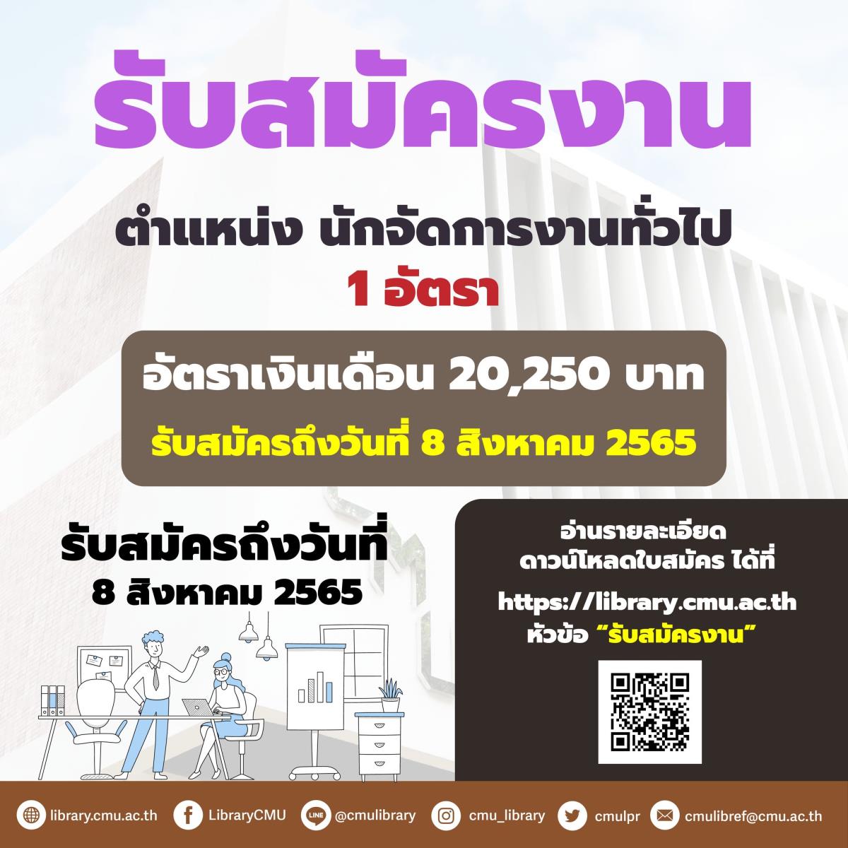 สำนักหอสมุดเปิดรับสมัครบุคคลตำแหน่ง นักจัดการงานทั่วไป 1 อัตรา ค่าจ้างเดือนละ 20,250 บาท เพื่อคัดเลือกบรรจุเป็นพนักงานมหาวิทยาลัยประจำ