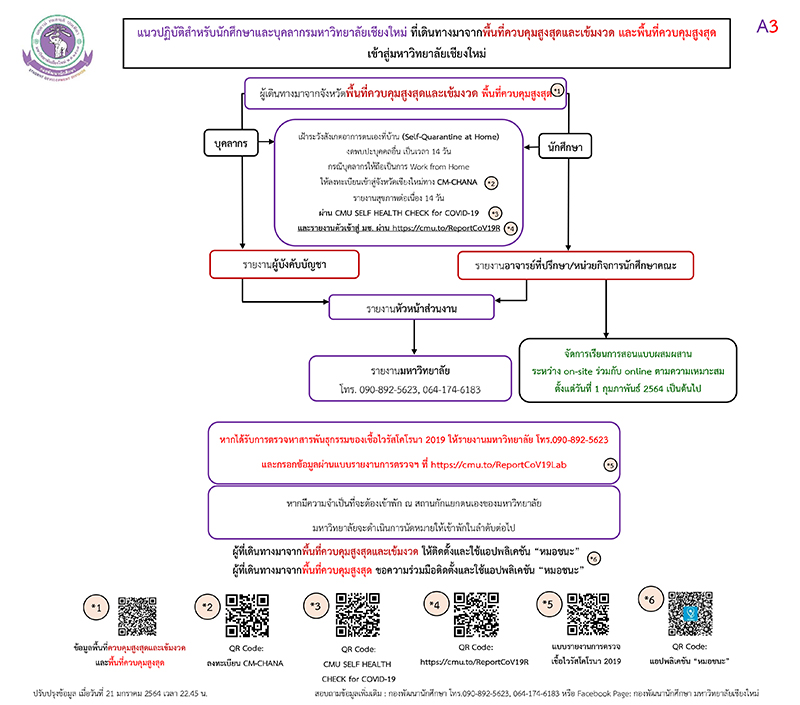 แนวปฏิบัติสำหรับนักศึกษาและบุคลากรมหาวิทยาลัยเชียงใหม่ ที่เดินทางมาจากพื้นที่ควบคุมสูงสุดและเข้มงวด และพื้นที่ควบคุมสูงสุด เข้าสู่มหาวิทยาลัยเชียงใหม่