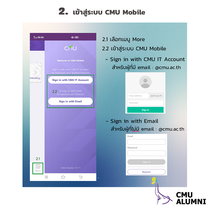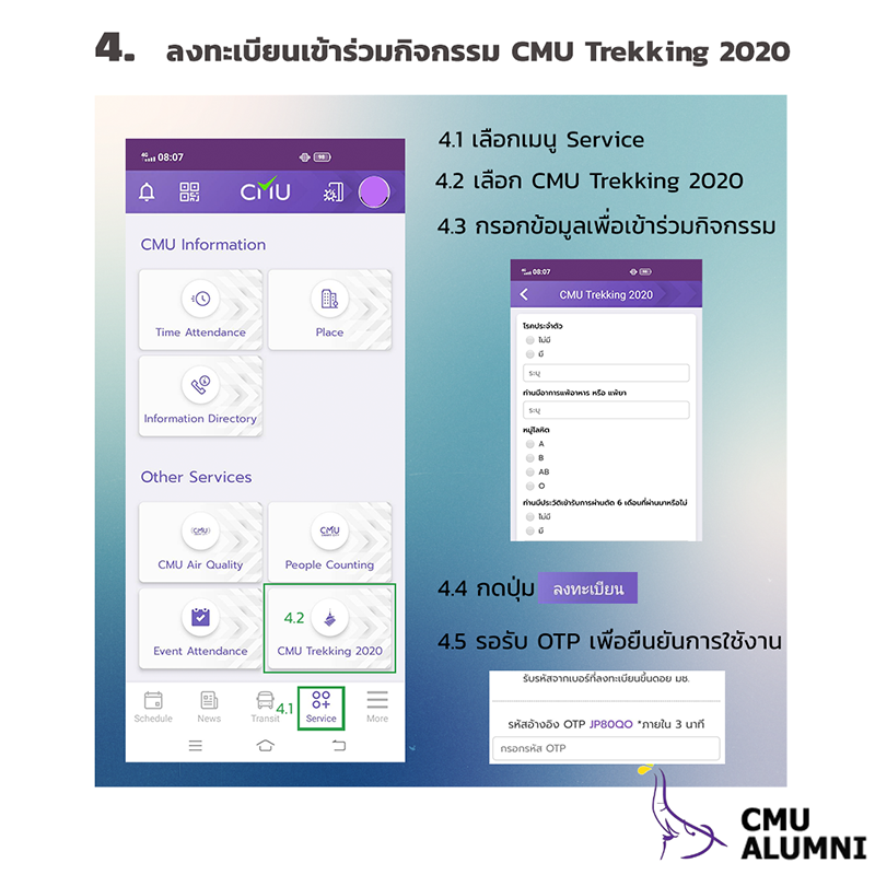 สำหรับนักศึกษาเก่าและบุคคลภายนอกที่ไม่มีบัญชี CMU IT Account สามารถลงทะเบียนด้วยการระบุ e-mail Address เลขบัตรประจำตัวประชาชน/Passport และหมายเลขโทรศัพท์ เมื่อลงทะเบียนเสร็จสิ้นแล้ว ผู้เข้าร่วมกิจกรรมจะต้องทำแบบประเมินสุขภาพ online ผ่าน CMU Mobile เป็นเวลา 14 วัน ต่อเนื่องกัน ตั้งแต่วันที่ 22 พฤศจิกายน - 5 ธันวาคม 2563 ทั้งนี้ระบบจะปิดให้บริการชั่วคราวเพื่อประมวลผลข้อมูลระหว่าง เวลา 00.00 - 03.00 น.