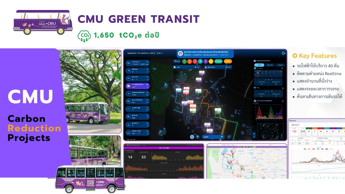 - ด้านการขนส่ง: ให้บริการรถไฟฟ้า (CMU Electric Mass Transit) จำนวนกว่า 40 คัน พร้อมแอปพลิเคชัน ติดตามตำแหน่งแบบ Real-time ซึ่งช่วยลดการปล่อยคาร์บอนได้ถึง 1,650 ตันต่อปี