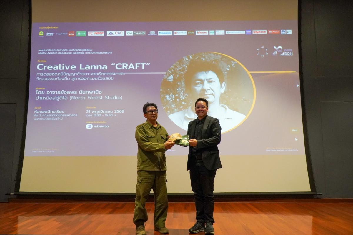 หัวข้อ “Creative Lanna ‘CRAFT’ การต่อยอดภูมิปัญญาล้านนา งานหัตถกรรม และวัฒนธรรมท้องถิ่น สู่งานออกแบบร่วมสมัย” ในวันที่ 21 พฤศจิกายน 2568 ณ ห้องออดิทอเรียม ชั้น 3 คณะสถาปัตยกรรมศาสตร์ มช. โดยได้รับเกียรติจาก อาจารย์จุลพร นันทพานิช นักออกแบบและผู้ก่อตั้งป่าเหนือสตูดิโอ (North Forest Studio) เป็นวิทยากรถ่ายทอดประสบการณ์ มุมมอง และแนวคิดการพัฒนาอัตลักษณ์ท้องถิ่นให้เกิดคุณค่าบนเวทีร่วมสมัย โดยมี อ.ดร.ภูมิ ทรัพย์ไพบูลย์กิจ และ ผศ.กานต์ คำแก้ว เป็นผู้ดำเนินรายการ