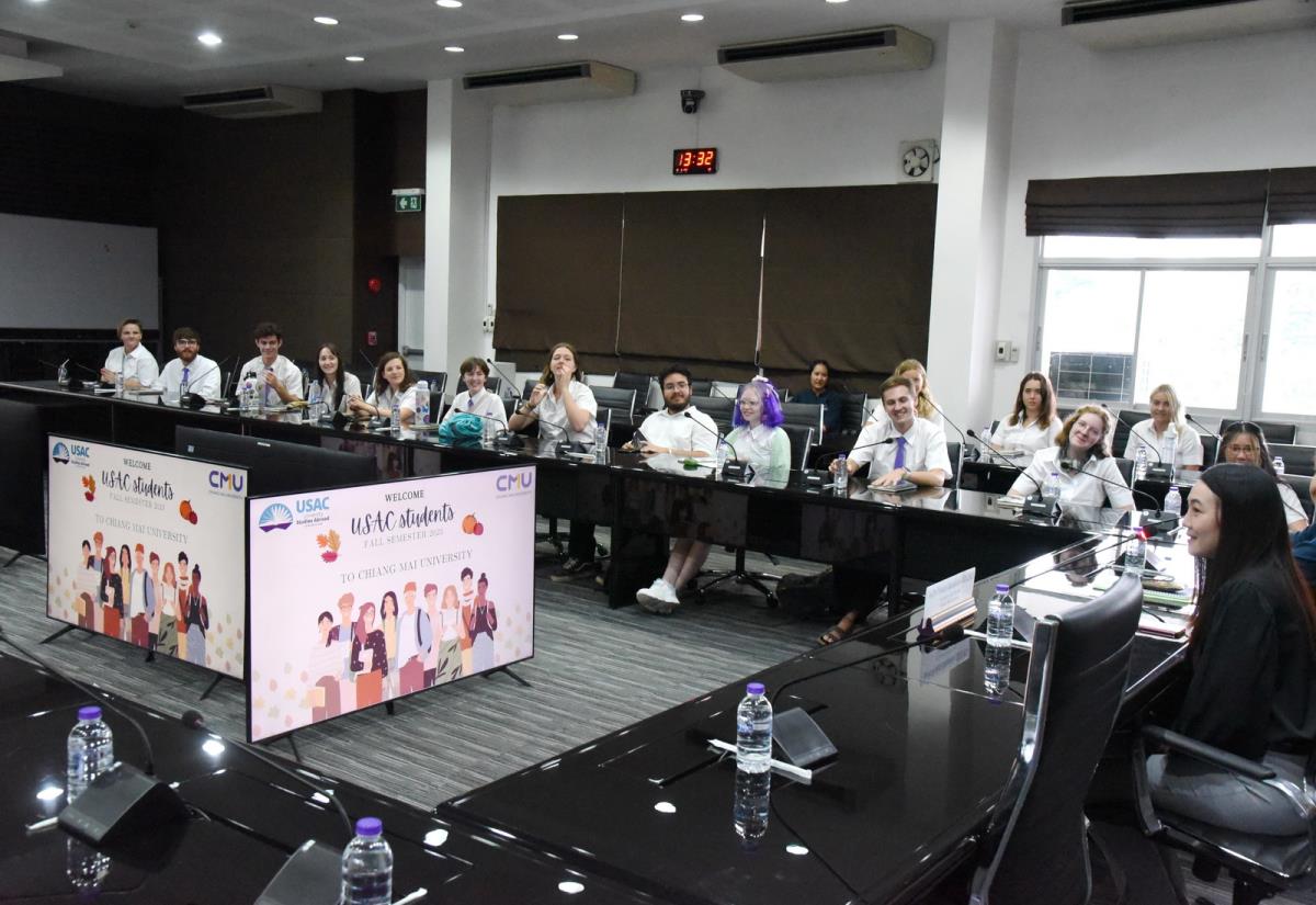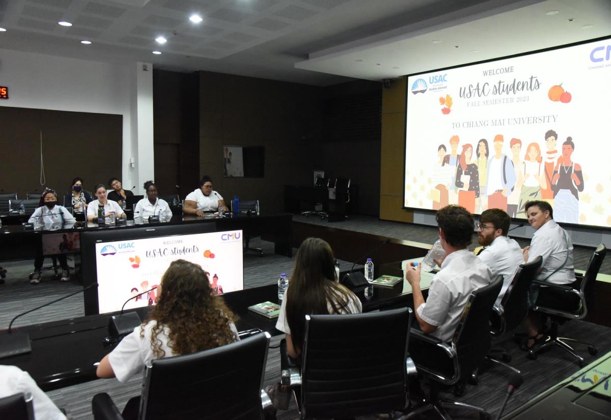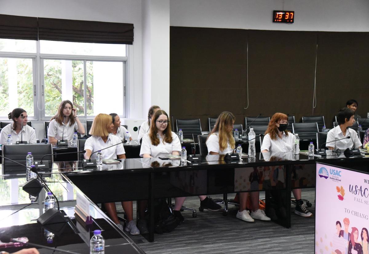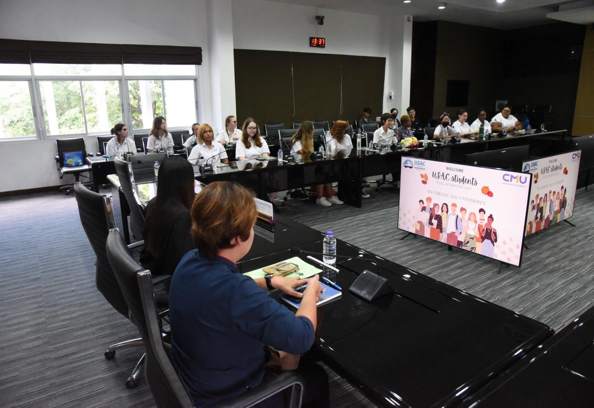 ผู้ช่วยศาสตราจารย์ ดร.ทพญ.วรกัญญา บูรณพัฒนา ผู้ช่วยอธิการบดีมหาวิทยาลัยเชียงใหม่ กล่าวต้อนรับและแลกเปลี่ยนข้อคิดเห็นกับนักศึกษาอเมริกันในโครงการ USAC Fall Semester 2023 โดยมีอาจารย์ฉายดรุณ ทิพวรรณ ผู้อำนวยการโครงการ USAC ร่วมต้อนรับ ณ ห้องประชุมบัวเรศ คำทอง ชั้น 5 อาคารสำนักงานมหาวิทยาลัย 2 มหาวิทยาลัยเชียงใหม่ วันศุกร์ที่ 15 กันยายน พ.ศ. 2566