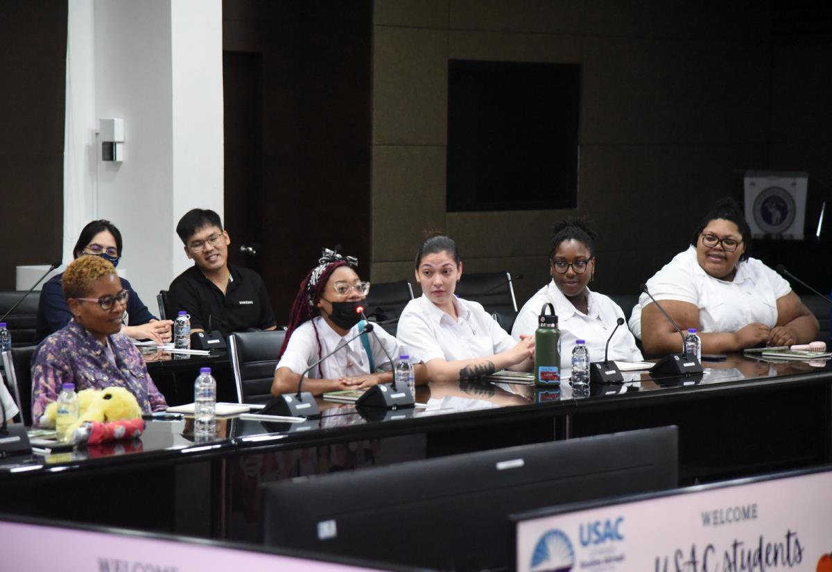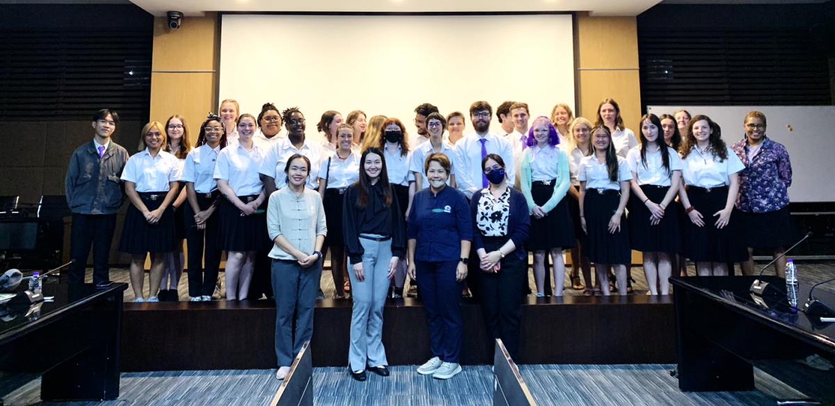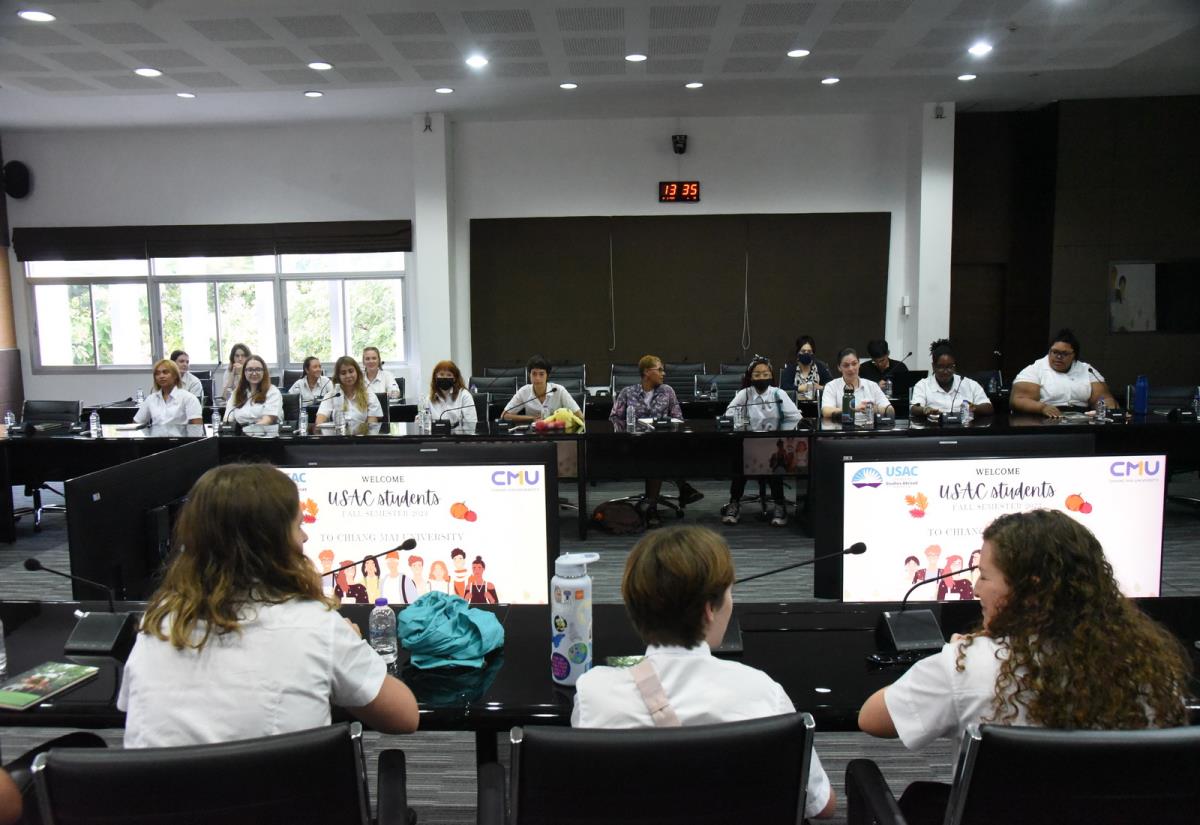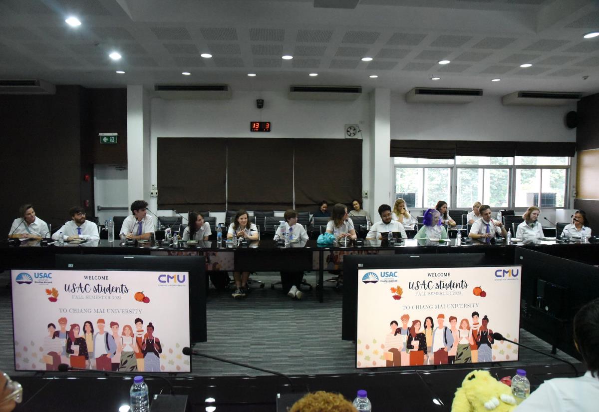 ผู้ช่วยศาสตราจารย์ ดร.ทพญ.วรกัญญา บูรณพัฒนา ผู้ช่วยอธิการบดีมหาวิทยาลัยเชียงใหม่ กล่าวต้อนรับและแลกเปลี่ยนข้อคิดเห็นกับนักศึกษาอเมริกันในโครงการ USAC Fall Semester 2023 โดยมีอาจารย์ฉายดรุณ ทิพวรรณ ผู้อำนวยการโครงการ USAC ร่วมต้อนรับ ณ ห้องประชุมบัวเรศ คำทอง ชั้น 5 อาคารสำนักงานมหาวิทยาลัย 2 มหาวิทยาลัยเชียงใหม่ วันศุกร์ที่ 15 กันยายน พ.ศ. 2566
