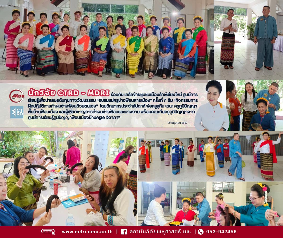 เมื่อวันเสาร์ที่ 6 กรกฎาคม 2567 ได้มีการจัดอบรมเชิงปฏิบัติการ (Workshop) เพื่อนำเสนอต้นทุนทางวัฒนธรรม “อบรมแม่ครูช่างฟ้อนลายเมือง" ครั้งที่ 8 ณ ห้องประชุมชั้น 2 สถาบันวิจัยพหุศาสตร์ มหาวิทยาลัยเชียงใหม่