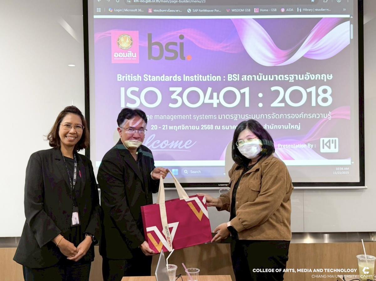 ศูนย์การพัฒนาองค์ความรู้และการจัดการนวัตกรรม (Knowledge and Innovation Development: KIND) วิทยาลัยศิลปะ สื่อ และเทคโนโลยี มหาวิทยาลัยเชียงใหม่ ร่วมกับ ธนาคารออมสิน สำนักงานใหญ่ นำโดย ผู้ช่วยศาสตราจารย์ ดร.อัจฉรา คำอักษร ผู้ปฏิบัติหน้าที่ช่วยคณบดี ด้านการพัฒนาองค์ความรู้และการจัดการนวัตกรรม/ หัวหน้าศูนย์การพัฒนาองค์ความรู้และนวัตกรรม (Knowledge and Innovation Development: KIND) ดำเนินการให้คำปรึกษาฯ เกี่ยวกับการตรวจประเมินภายในตามกรอบมาตรฐาน ISO 30401: 2018 ให้แก่ ทีมงานด้านการจัดการความรู้ ธนาคารออมสิน สำนักงานใหญ่ ภายใต้โครงการ "หลักสูตรการพัฒนาและเสริมสร้างขีดความสามารถด้านการจัดการความรู้ " ในระหว่างวันที่ 20 - 21 พฤศจิกายน 2568 ณ ธนาคารออมสิน สำนักงานใหญ่