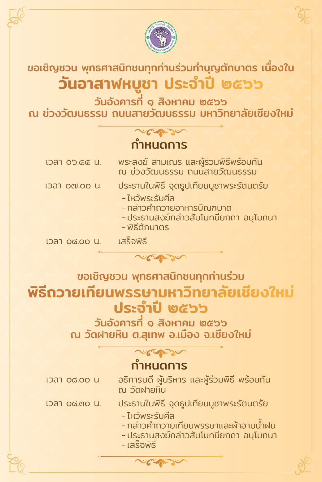 และเวลา 08.00 น.ขอเชิญชวน พิธีถวายเทียนพรรษามหาวิทยาลัยเชียงใหม่ประจำปี 2566 วันอังคารที่ 1 สิงหาคม 2566 ณ วัดฝายหิน ต.สุเทพ อ.เมือง จ.เชียงใหม่
