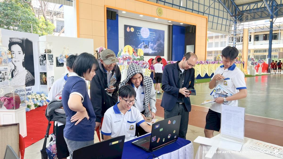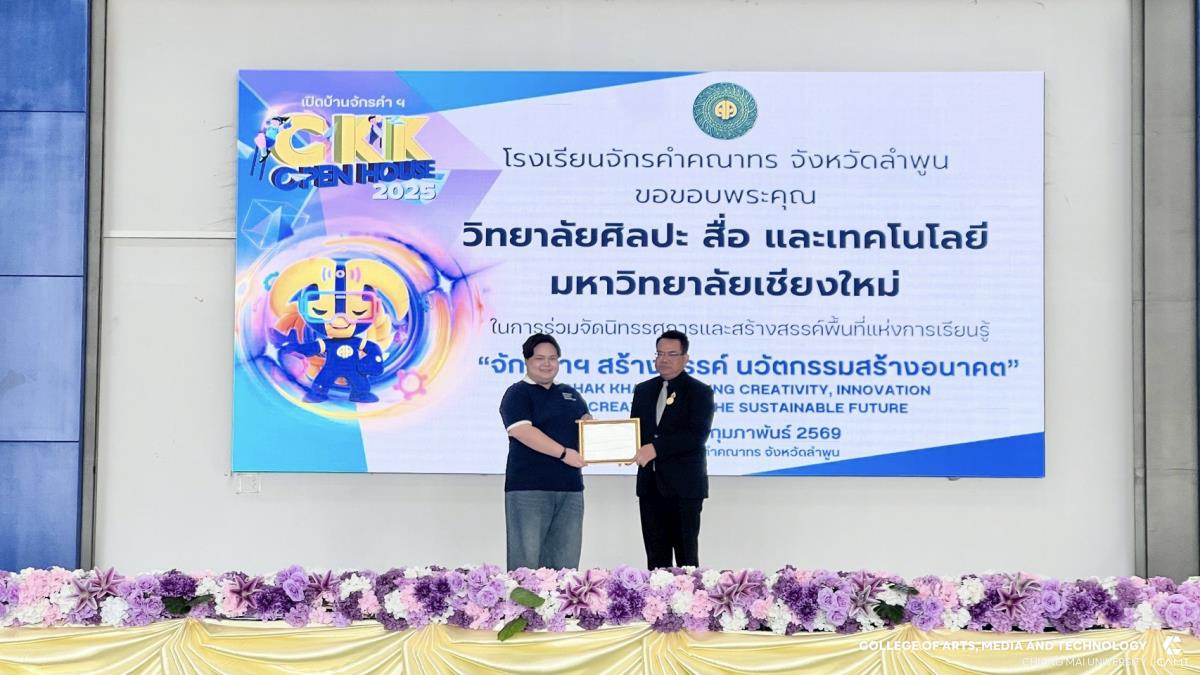 วิทยาลัยศิลปะ สื่อ และเทคโนโลยี มหาวิทยาลัยเชียงใหม่ ร่วมจัดนิทรรศการในงานเปิดบ้านจักรคำฯ CKK OPEN HOUSE 2025 “จักรคำฯ สร้างสรรค์ นวัตกรรมสร้างอนาคต Chak Kham Creativty, Innovation for a Sustainable Future” ประจำปีการศึกษา 2568 โดยมีวัตถุประสงค์เพื่อประชาสัมพันธ์ข้อมูลสำหรับเป็นแนวทางการตัดสินใจในการศึกษาต่อและประกอบอาชีพในอนาคตให้แก่นักเรียน ในวันจันทร์ที่ 2 กุมภาพันธ์ 2569 ณ บริเวณหน้าอาคารจักรคำ 115 ปี โรงเรียนจักรคำคณาทร จังหวัดลำพูน