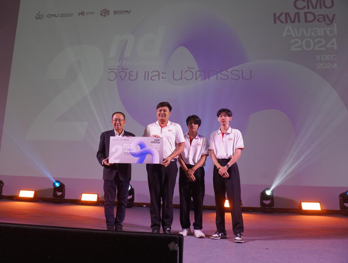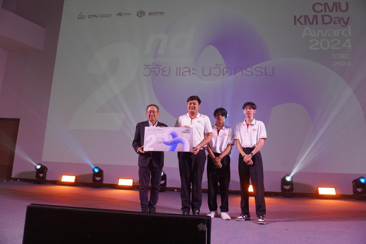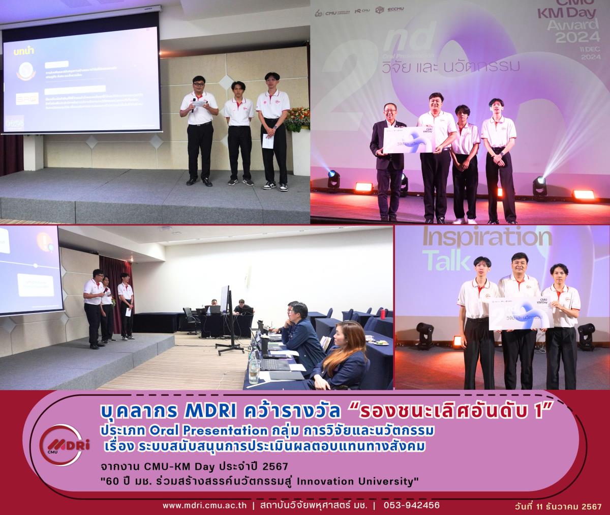 รางวัลรองชนะเลิศอันดับ 1 ประเภท Oral Presentation กลุ่ม การวิจัยและนวัตกรรม เรื่อง "ระบบสนับสนุนการประเมินผลตอบแทนทางสังคมจากการลงทุน" โดย นายกุลางกูร พัฒนเมธาดา ตำแหน่งนักวิชาการคอมพิวเตอร์ นายธีรพงษ์ หน่อแก้ว ตำแหน่งนักวิชาการคอมพิวเตอร์ และนายวรากร จันงาม ตำแหน่งนักจัดการงานทั่วไป สังกัดงานบริหารงานวิจัย บริการวิชาการและวิเทศสัมพันธ์ ในงาน CMU-KM Day ประจำปี 2567 "60 ปี มช. ร่วมสร้างสรรค์นวัตกรรมสู่ Innovation University" ซึ่งได้จัดให้มีการนำเสนอแบบบรรยาย (Oral Presentation) เมื่อวันที่ 9 ธันวาคม 2567 ณ สำนักบริการวิชาการ มหาวิทยาลัยเชียงใหม่