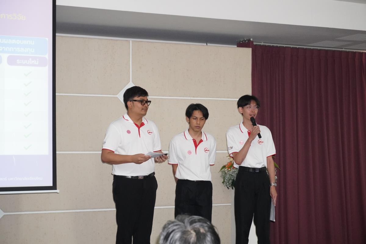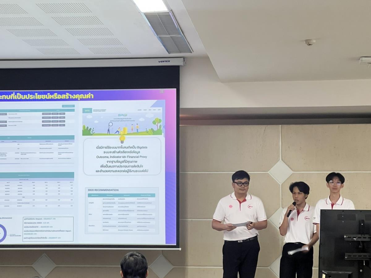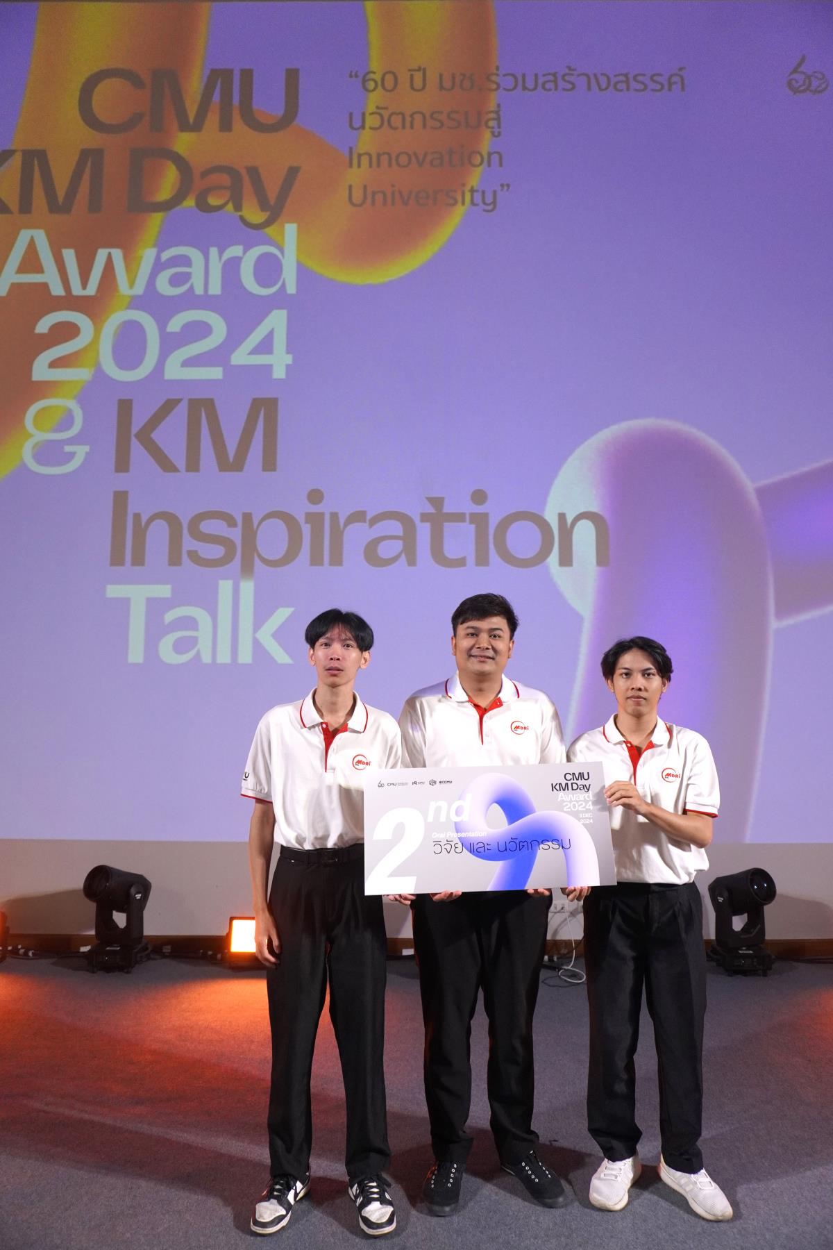 รางวัลรองชนะเลิศอันดับ 1 ประเภท Oral Presentation กลุ่ม การวิจัยและนวัตกรรม เรื่อง "ระบบสนับสนุนการประเมินผลตอบแทนทางสังคมจากการลงทุน" โดย นายกุลางกูร พัฒนเมธาดา ตำแหน่งนักวิชาการคอมพิวเตอร์ นายธีรพงษ์ หน่อแก้ว ตำแหน่งนักวิชาการคอมพิวเตอร์ และนายวรากร จันงาม ตำแหน่งนักจัดการงานทั่วไป สังกัดงานบริหารงานวิจัย บริการวิชาการและวิเทศสัมพันธ์ ในงาน CMU-KM Day ประจำปี 2567 "60 ปี มช. ร่วมสร้างสรรค์นวัตกรรมสู่ Innovation University" ซึ่งได้จัดให้มีการนำเสนอแบบบรรยาย (Oral Presentation) เมื่อวันที่ 9 ธันวาคม 2567 ณ สำนักบริการวิชาการ มหาวิทยาลัยเชียงใหม่