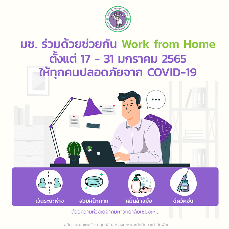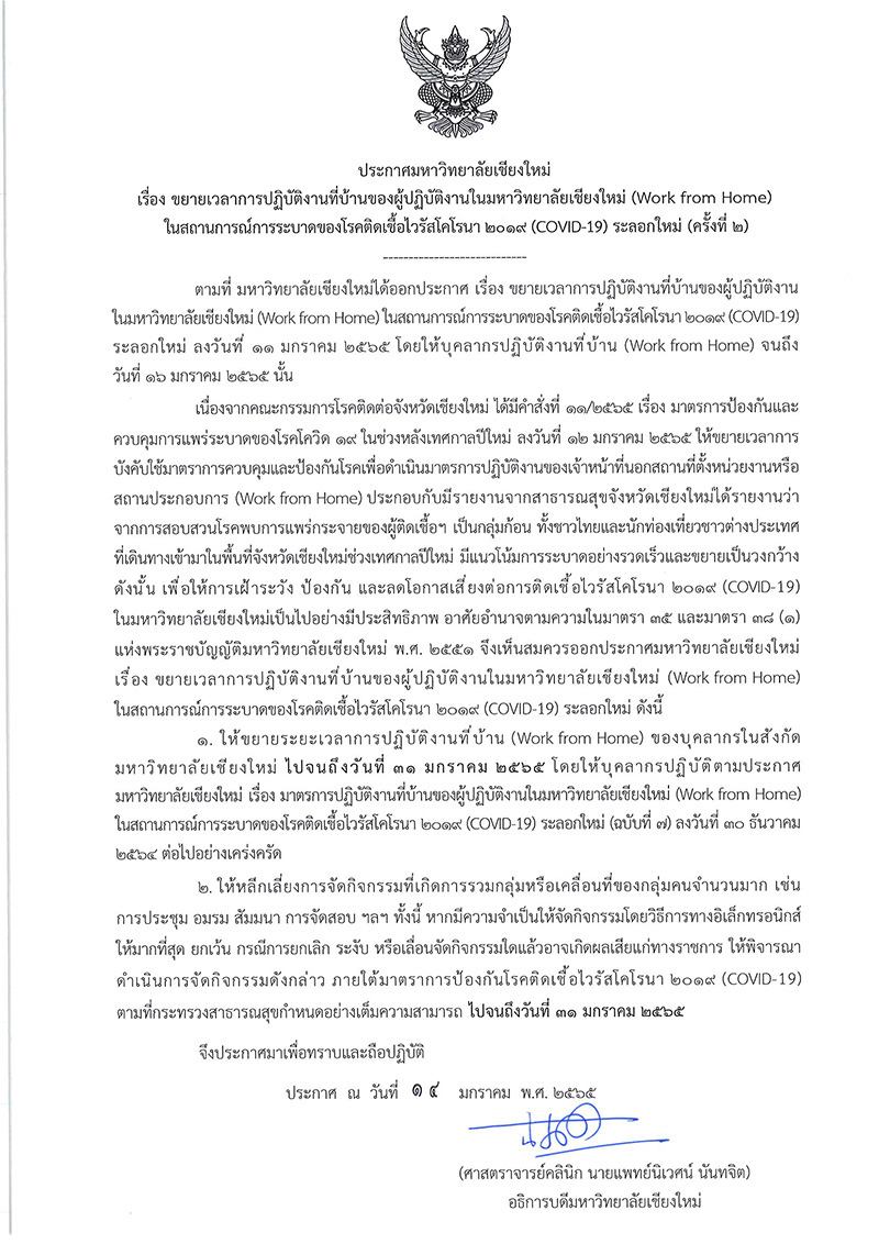 ประกาศ มช. ขยายเวลาการปฏิบัติงานที่บ้านของผู้ปฏิบัติงานในมหาวิทยาลัยเชียงใหม่ (Work from Home)ฯ (ครั้งที่ 2)