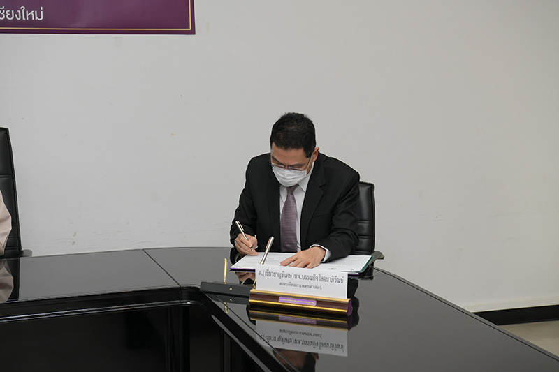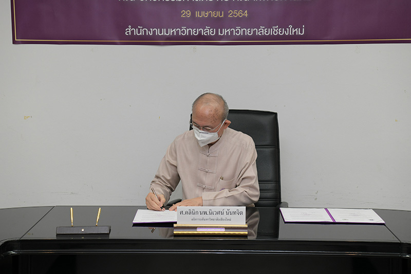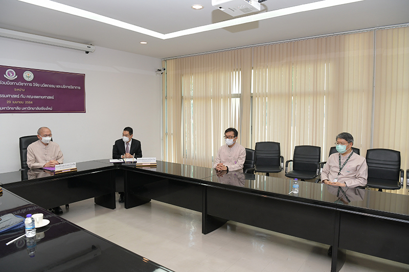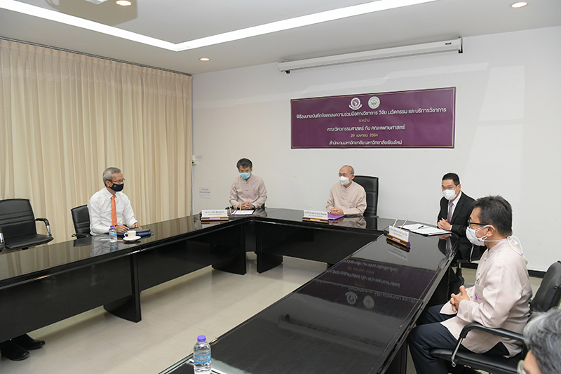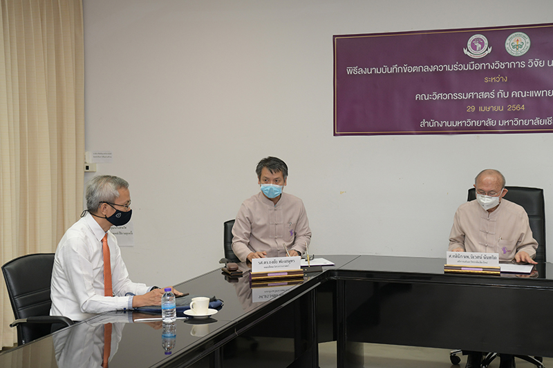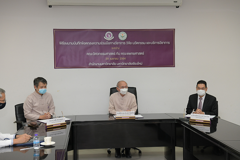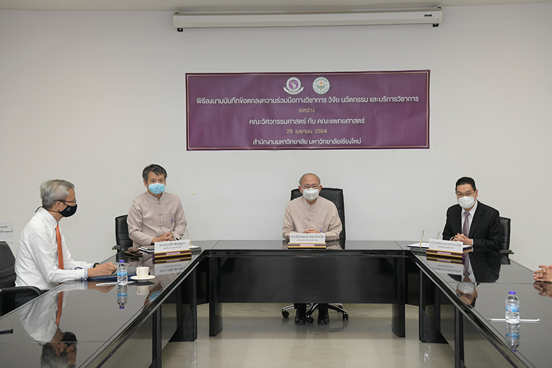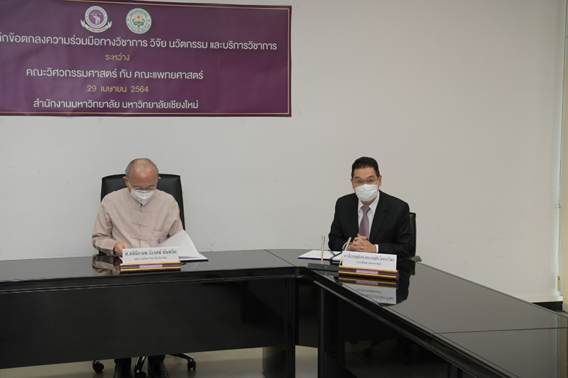 คณะแพทยศาสตร์ และคณะวิศวกรรมศาสตร์ มหาวิทยาลัยเชียงใหม่ ร่วมพิธีลงนามบันทึกข้อตกลงความร่วมมือทางวิชาการ วิจัย นวัตกรรม และบริการวิชาการ เมื่อวันพฤหัสบดีที่ 29 เมษายน พ.ศ. 2564 ณ ห้องประชุมบุญสม มาร์ติน อาคารยุทธศาสตร์ สำนักงานมหาวิทยาลัย มหาวิทยาลัยเชียงใหม่ โดยมี ศาสตราจารย์คลินิก นพ.นิเวศน์ นันทจิต อธิการบดีมหาวิทยาลัยเชียงใหม่ กล่าวแสดงความยินดี ศาสตราจารย์เชี่ยวชาญพิเศษ นพ.บรรณกิจ โลจนาภิวัฒน์ คณบดีคณะแพทยศาสตร์ รองศาสตราจารย์ ดร.ธงชัย ฟองสมุทร คณบดีคณะวิศวกรรมศาสตร์ ร่วมลงนาม พร้อมด้วยคณะผู้บริหารของทั้งสองหน่วยงานร่วมเป็นสักขีพยาน