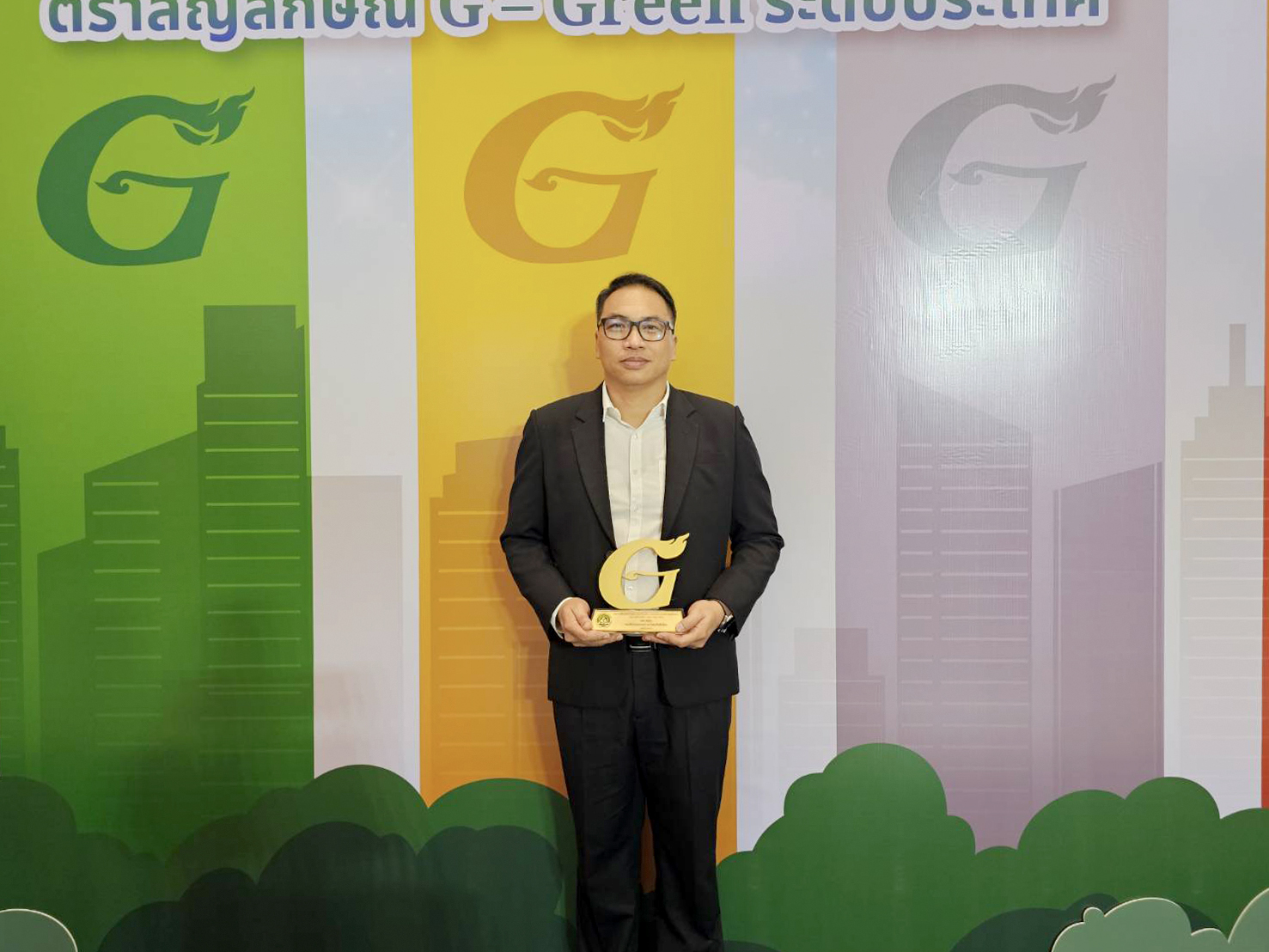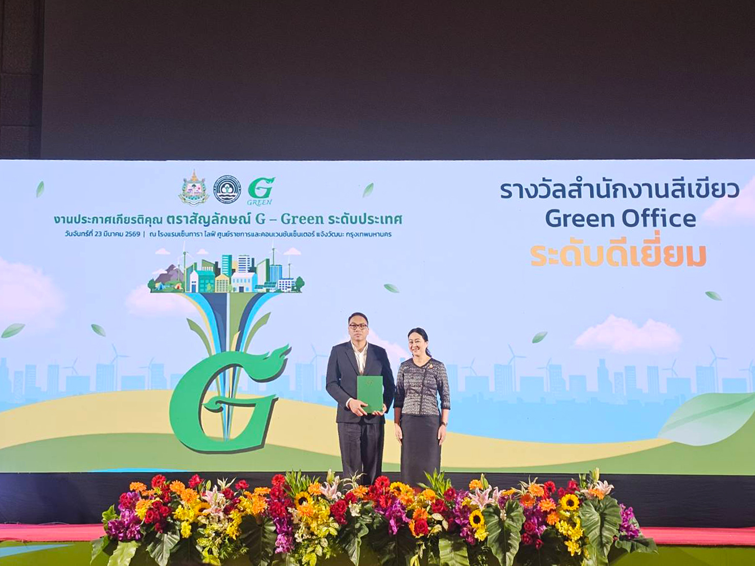 เมื่อวันที่ 23 มีนาคม 2569 ผศ. ดร. น.สพ.เฉลิมชาติ สมเกิด ผู้ช่วยคณบดีฝ่ายกายภาพ สิ่งแวดล้อม และเทคโนโลยีสารสนเทศ คณะสัตวแพทยศาสตร์ มหาวิทยาลัยเชียงใหม่ พร้อมด้วยคุณอรุณี เผ่าพงษ์ เลขานุการคณะสัตวแพทยศาสตร์ เข้ารับมอบ รางวัลตราสัญลักษณ์ G-Green ระดับประเทศ ภายใต้โครงการสำนักงานสีเขียว (Green Office) ประจำปี 2568 โดยในปีนี้คณะฯ ได้รับการรับรองในระดับดีเยี่ยม (G-Gold) ด้วยคะแนนรวม 95.93 คะแนน จาก 100 คะแนน ซึ่งเป็นผลสืบเนื่องจากการดำเนินงานด้านสิ่งแวดล้อมอย่างต่อเนื่องและเป็นรูปธรรม หลังจากในปีที่ผ่านมาได้รับรางวัลในระดับดีมาก (G-Silver)