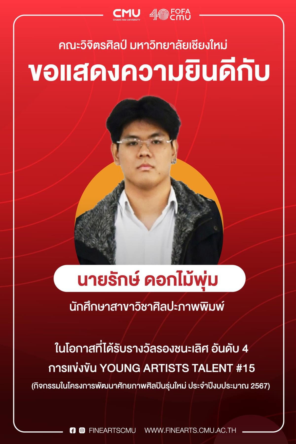 นายรักษ์ ดอกไม้พุ่ม นักศึกษาสาขาวิชาศิลปะภาพพิมพ์ คณะวิจิตรศิลป์ มหาวิทยาลัยเชียงใหม่ ได้รับรางวัลรองชนะเลิศ อันดับ 4 การแข่งขัน YOUNG ARTISTS TALENT #15 (กิจกรรมในโครงการพัฒนาศักยภาพศิลปินรุ่นใหม่ ประจำปีงบประมาณ 2567) และเดินทางไปต่อยอดการฝึกอบรมเชิงปฏิบัติการขั้นสูงและศึกษาดูงาน ด้านศิลปะในต่างประเทศ รวมถึงผลงาน ของศิลปินรุ่นใหม่ที่ได้รับคัดเลือกให้เข้าร่วมโครงการทั้งหมดจะได้นำไปจัดแสดงในนิทรรศการการแสดงผลงาน ของศิลปินรุ่นใหม่ ณ จังหวัดภูเก็ต จัดโดย สำนักงานศิลปวัฒนธรรมร่วมสมัย