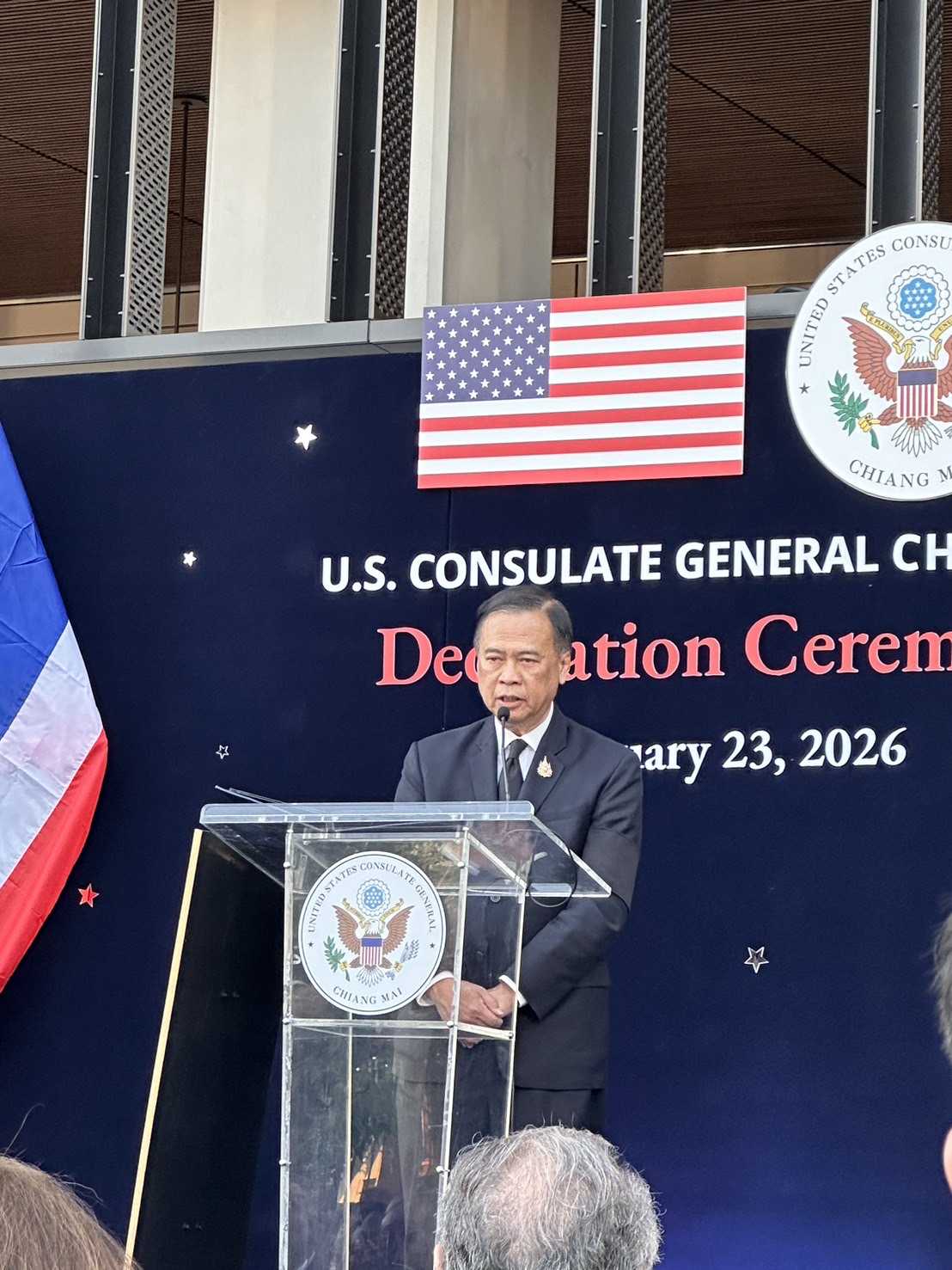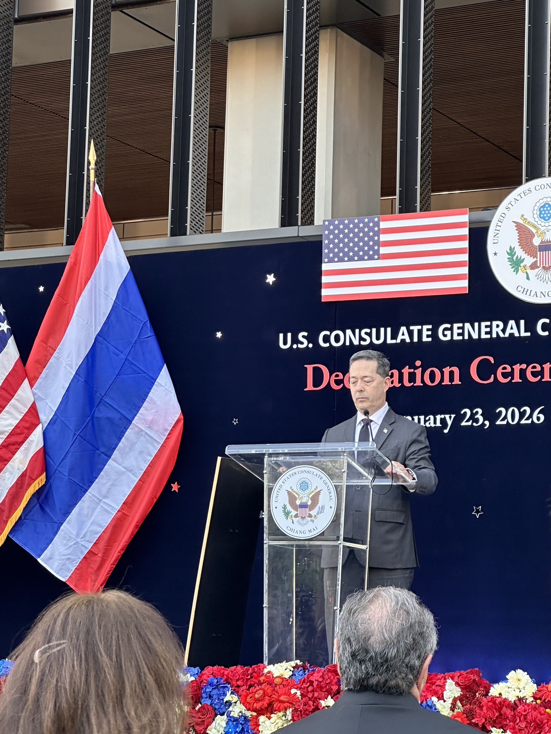 ในพิธีเปิดมีคุณไมเคิล เจ. รีกาส รัฐมนตรีช่วยว่าการกระทรวงการต่างประเทศสหรัฐฯ ฝ่ายบริหารธุรการและทรัพยากร และ คุณฌอน เค. โอนีลล์ เอกอัครราชทูตสหรัฐฯ ประจำประเทศไทย ร่วมเป็นประธาน เน้นย้ำบทบาทของอาคารสถานกงสุลใหม่แห่งนี้ในฐานะศูนย์กลางที่ปลอดภัยและทันสมัยในการให้บริการพลเมืองอเมริกันกว่า 21,000 คนทั่วภาคเหนือของไทย ตลอดจนการทำงานกับภาคีชาวไทยในการทำให้ประเทศของเราทั้งสองปลอดภัยขึ้น แข็งแกร่งขึ้น และมั่งคั่งขึ้นกว่าเดิม