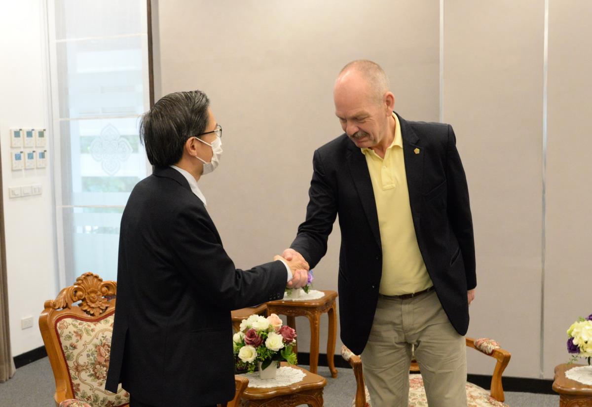 รองศาสตราจารย์ ดร.ปิยะพงศ์ เนียมทรัพย์ ผู้ช่วยอธิการบดีมหาวิทยาลัยเชียงใหม่ ให้การต้อนรับ Professor Ian Wooton, Vice Dean (International) Strathclyde Business School, University of Strathclyde สหราชอาณาจักร เพื่อหารือความร่วมมือทางวิชาการ ในการทำโครงการปริญญาคู่ 1+1 ในระดับบัณฑิตศึกษา ระหว่าง Strathclyde Business School และวิทยาลัยนานาชาตินวัตกรรมดิจิทัล ณ ห้องรับรอง ม.ล.ปิ่น มาลากุล สำนักงานมหาวิทยาลัย วันพฤหัสบดีที่ 17 พฤศจิกายน 2565