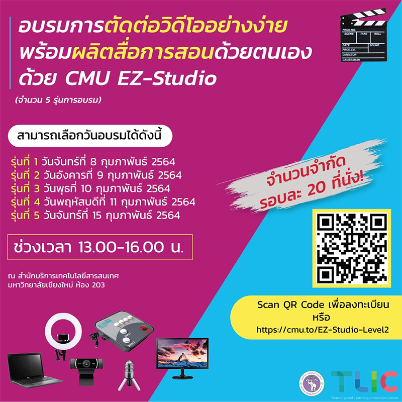 ศูนย์นวัตกรรมการสอนและการเรียนรู้ (TLIC) มหาวิทยาลัยเชียงใหม่ ขออัพเกรดการอบรมขั้นกว่า!หลังจากการอบรมการเรียนรู้เครื่องมือเบื้องต้นเชิญชวนอาจารย์ มช. มาต่อยอดกับการอบรม “ตัดต่อวิดีโออย่างง่ายพร้อมผลิตสื่อการสอนด้วยตนเองด้วย CMU EZ-Studio”
