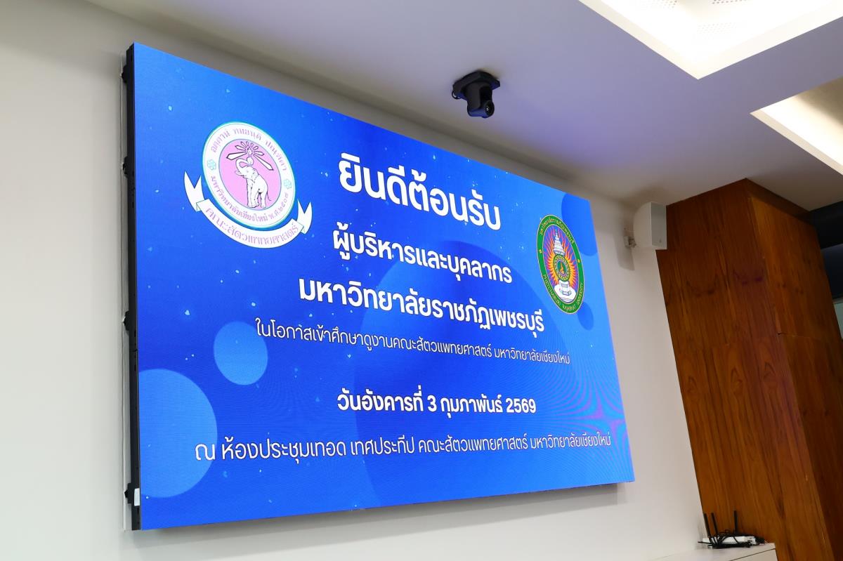 เมื่อวันที่ 3 กุมภาพันธ์ 2569 ศ. (เชี่ยวชาญพิเศษ) ดร. น.สพ.กรกฎ งานวงศ์พาณิชย์ คณบดีคณะสัตวแพทยศาสตร์ มหาวิทยาลัยเชียงใหม่ ให้การต้อนรับ รศ. ดร.พัชรศักดิ์ อาลัย อธิการบดีมหาวิทยาลัยราชภัฏเพชรบุรี พร้อมด้วยคณะผู้บริหารและบุคลากรจากมหาวิทยาลัยราชภัฏเพชรบุรี จังหวัดเพชรบุรี ในโอกาสเข้าศึกษาดูงาน ณ คณะสัตวแพทยศาสตร์ มหาวิทยาลัยเชียงใหม่ เพื่อแลกเปลี่ยนองค์ความรู้ด้านการจัดการศึกษา การให้บริการสุขภาพสัตว์ และการพัฒนางานวิชาการอย่างเป็นระบบ
