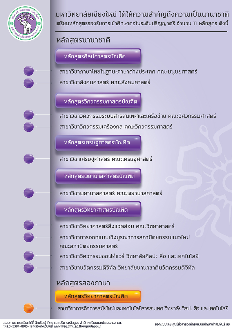 ผู้สนใจสอบถามรายละเอียดได้ที่ ฝ่ายรับเข้าศึกษาและบริหารหลักสูตร สำนักทะเบียนและประมวลผล มหาวิทยาลัย เชียงใหม่ โทร.0 5394 8915-19 หรือทางเว็บไซต์ www1.reg.cmu.ac.th/ugradapply