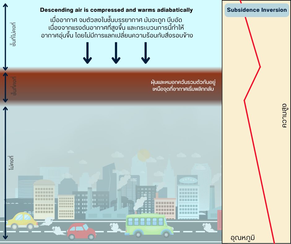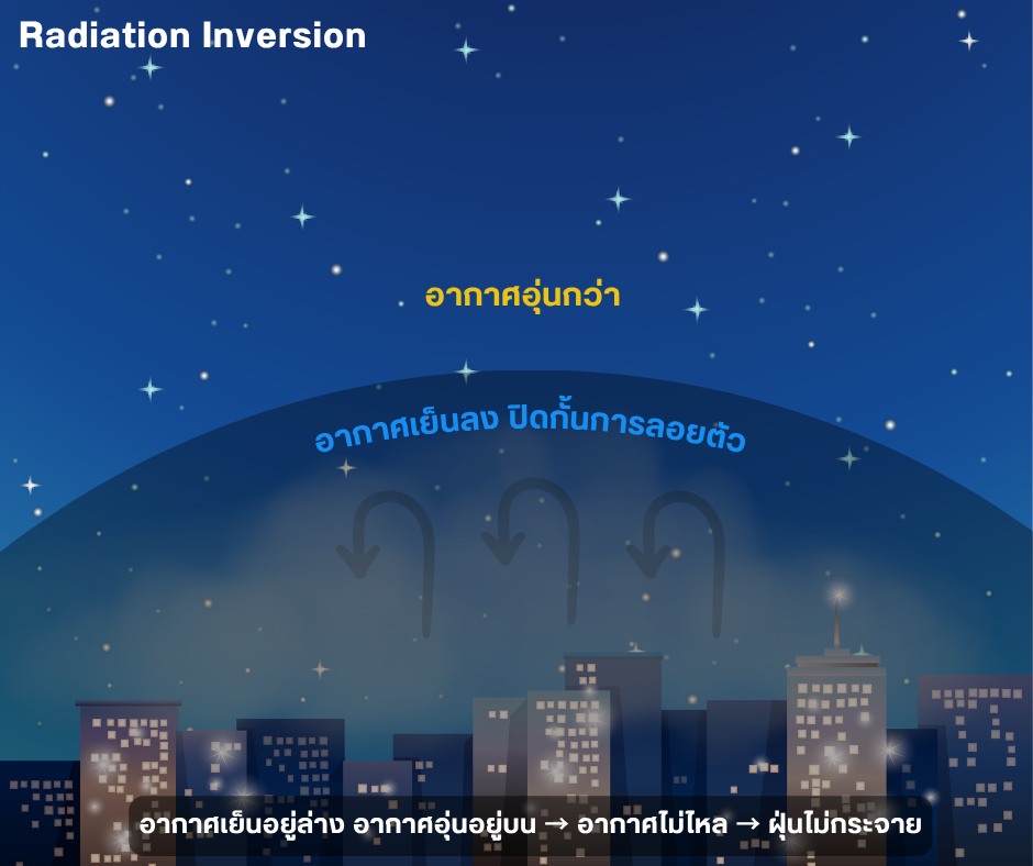 ช่วงนี้สถานการณ์ฝุ่นควัน PM2.5 ยังคงน่าเป็นห่วง โดยเฉพาะในภาคเหนือตอนบนที่มีค่าฝุ่น PM2.5 สูง และยังคงมีแนวโน้มสะสมต่อเนื่อง ซึ่งอีกสาเหตุสำคัญมาจากปรากฏการณ์ Temperature Inversion (ชั้นอุณหภูมิผกผัน) โดยทั่วไปในชั้นอุณหภูมิปกติ อากาศอุ่นจะลอยตัวขึ้น พาฝุ่นและมลพิษกระจายออกไป แต่ช่วงเย็นถึงกลางคืน อากาศใกล้พื้นจะเย็นกว่าอากาศด้านบน เลยเกิดชั้นอากาศเหมือน “ฝาปิด” กักฝุ่นและมลพิษเอาไว้ข้างล่าง ทำให้อากาศแย่