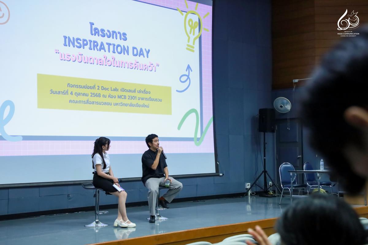 คณะการสื่อสารมวลชน มหาวิทยาลัยเชียงใหม่ จัดกิจกรรม Inspiration Day แรงบันดาลใจในการค้นคว้า “Doc Lab: เปิดเลนส์ เล่าเรื่อง” โดยได้รับเกียรติจาก คุณไก่ ณฐพล บุญประกอบ ผู้กำกับภาพยนตร์สารคดีและผู้กำกับซีรีส์ชื่อดังบน Netflix มาร่วมบรรยายพิเศษในหัวข้อ “The Art of Adaptation: แปลงความจริงเป็นหนัง” ถ่ายทอดแนวคิดและแรงบันดาลใจจากประสบการณ์จริงในวงการภาพยนตร์ เพื่อจุดประกายแรงบันดาลใจในการสร้างสรรค์ผลงานสารคดีให้กับนักศึกษา โดยมีนักศึกษาจากกระบวนวิชา 851347 การผลิตรายการข่าวและสาระบันเทิง (News and Entertainment Program Production) และนักศึกษาที่สนใจเข้าร่วมกิจกรรมฯ ณ ห้อง MCB 2301 อาคารเรียนรวม คณะการสื่อสารมวลชน มหาวิทยาลัยเชียงใหม่ ในวันเสาร์ที่ 4 ตุลาคม 2568 เวลา 13.00 - 17.00 น.