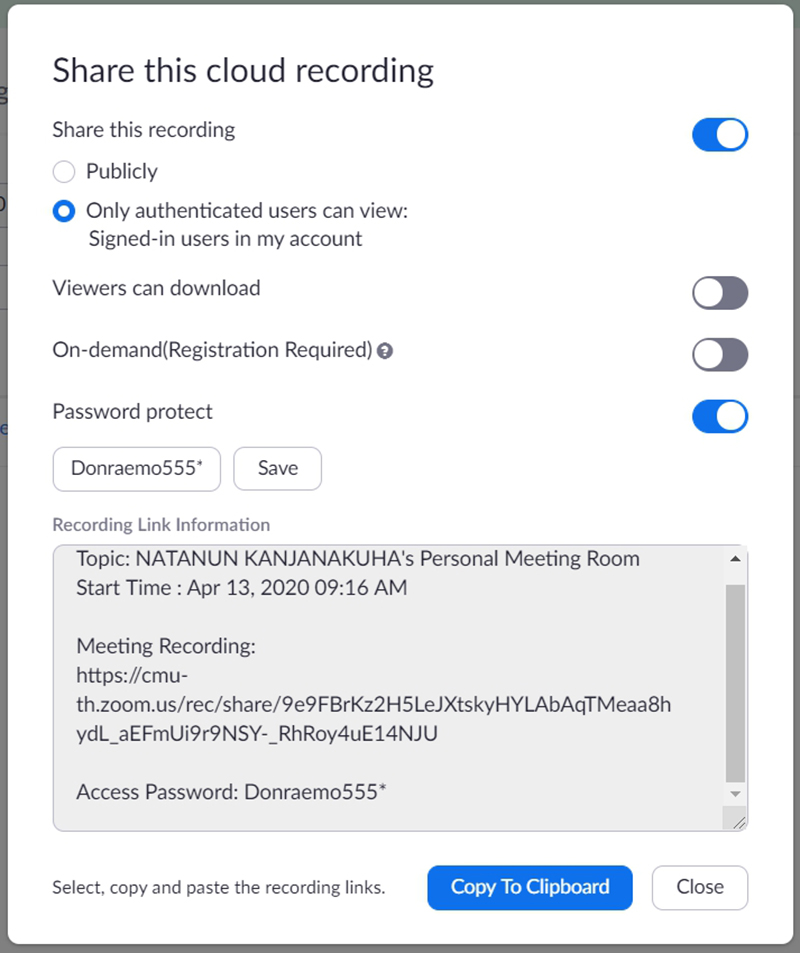 เมื่อกดที่ปุ่มแชร์ให้ทำการตั้งค่า Password และเลือกเฉพาะผู้ที่ Login เท่านั้นในการเข้าดูบันทึกได้หลังจากนั้นจึงสามารถนำ Link ส่งต่อให้คนที่ต้องการเข้าดูบันทึกการประชุมหรือการสอนย้อนหลังดังภาพ