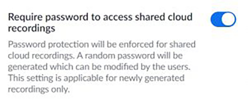 ข้อควรสังเกตและพึงระวังเพื่อความปลอดภัยในการบันทึกการประชุมหรือการสอนนั้น เราสามารถเลือกบันทึกเก็บไว้บน Cloud หรือเก็บไว้ในคอมพิวเตอร์ของเราก็ได้ ในกรณีเลือกแบบ Cloud เราจะมีพื้นที่จัดเก็บ 1 GB ควรเข้าไปตั้งค่าที่ https://cmu-th.zoom.us/profile/setting?tab=recording ก่อนและทำการเลือกการตั้งค่า Password ดังภาพ