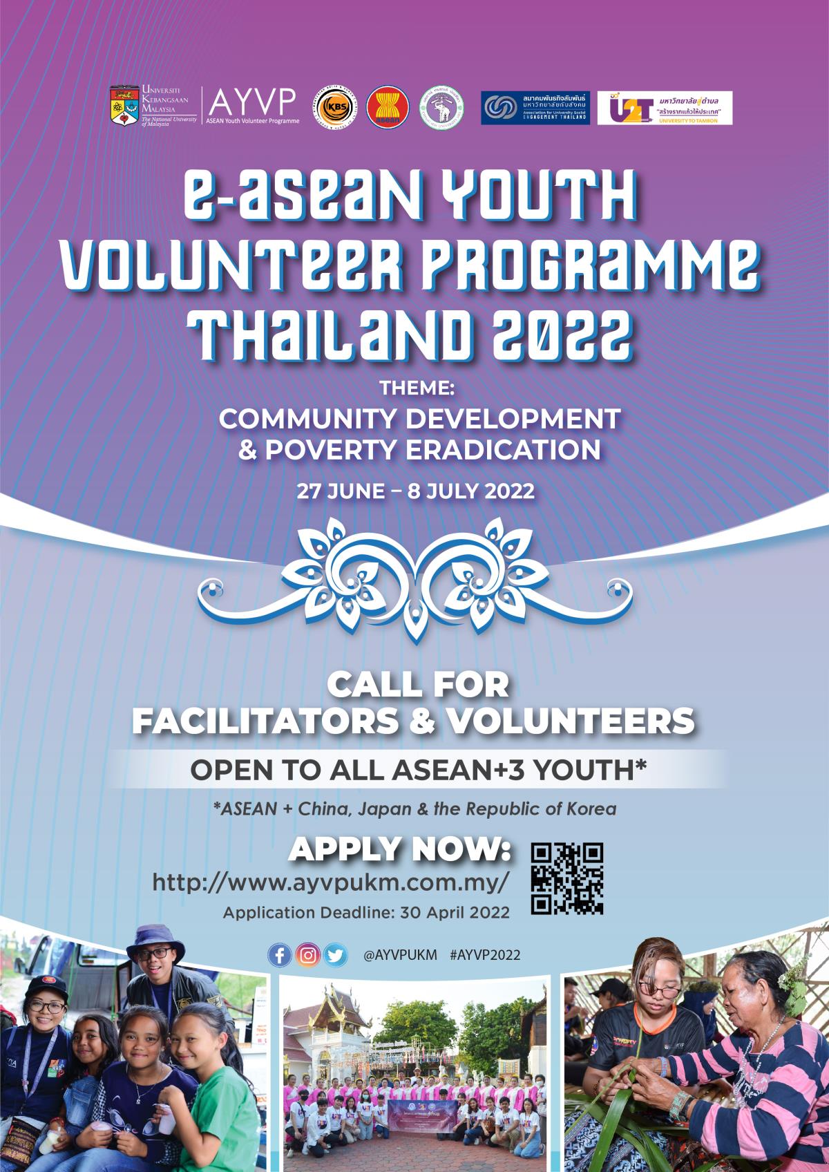 มหาวิทยาลัยเชียงใหม่ (Chiang Mai University: CMU) และ มหาวิทยาลัยเคบังซาอันมาเลเซีย (Universiti Kebangsaan Malaysia – The National University of Malaysia (UKM) ได้ร่วมมือกันเป็นเจ้าภาพหลัก จัดโครงการ The e-ASEAN Youth Volunteer Programme (AYVP) Thailand 2022 ครั้งที่ 10 ระหว่างวันที่ 27 มิถุนายน – 8 กรกฎาคม 2565