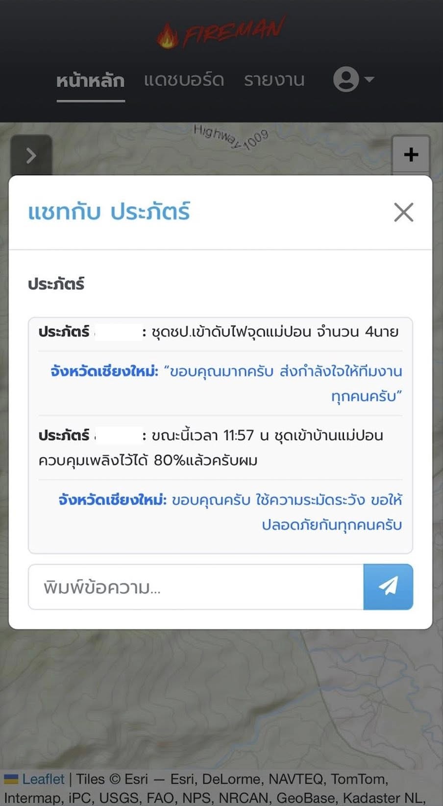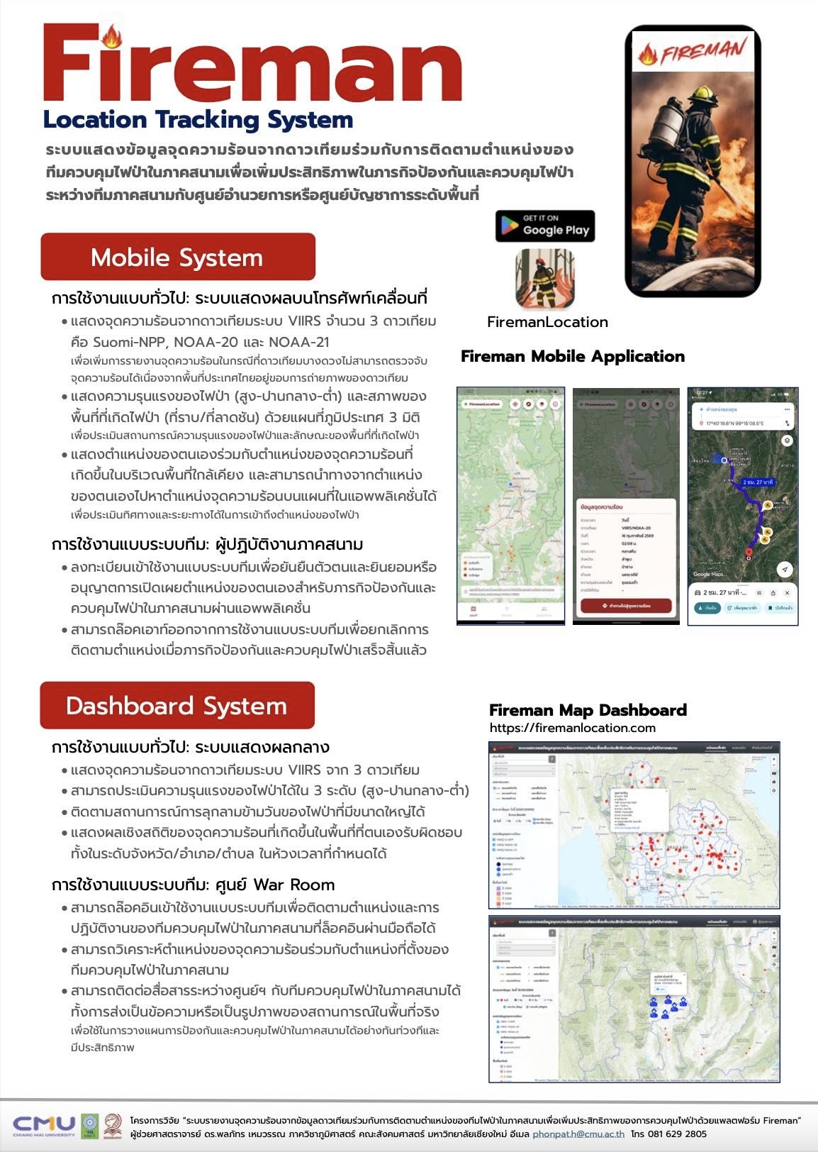 • Mobile Application: FiremanLocation สำหรับทีมปฏิบัติงานภาคสนาม ใช้รายงานตำแหน่งและสถานการณ์จริง