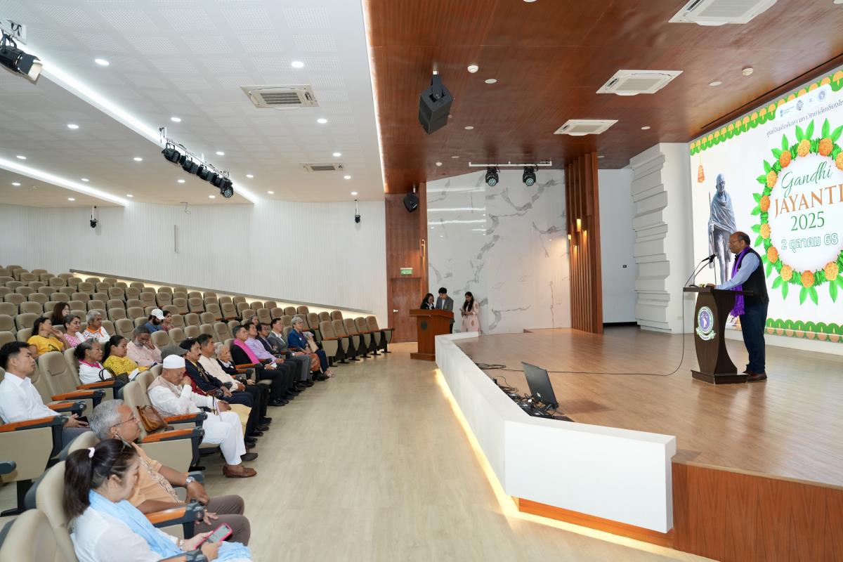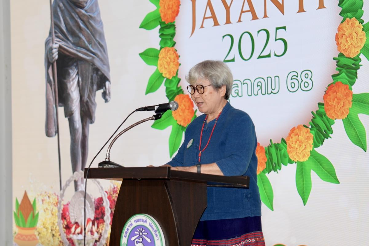 ศาสตราจารย์ นายแพทย์พงษ์รักษ์ ศรีบัณฑิตมงคล อธิการบดีมหาวิทยาลัยเชียงใหม่ กล่าวรำลึกถึงมหาตมะ คานธี โดยเน้นว่า หลักการแห่งสัจจะ อหิงสา และความพอเพียงเป็นมรดกทางจิตวิญญาณที่ยังคงคุณค่าเหนือกาลเวลา การประดิษฐานรูปปั้นคานธีในมหาวิทยาลัยถือเป็นเกียรติและเป็นเครื่องเตือนใจถึงแก่นแท้ของการศึกษา คือการบ่มเพาะทั้งความรู้และคุณธรรม อธิการบดียังได้กล่าวถึงวิถีมังสวิรัติของคานธีว่าเป็นหนทางแห่งความเมตตาและการอยู่ร่วมกับธรรมชาติอย่างสมดุล สอดคล้องกับแนวทางการพัฒนาที่ยั่งยืน พร้อมชื่นชมสมาคมมังสวิรัติไทย–นานาชาติที่จัดทำหนังสือเผยแพร่ความรู้ด้านโภชนาการและการกินมังสวิรัติ ซึ่งไม่เพียงเป็นประโยชน์ต่อสุขภาพ หากยังสืบสานเจตนารมณ์ของคานธี และสะท้อนว่า “การเลือกอาหาร คือการเลือกอนาคตของโลก”